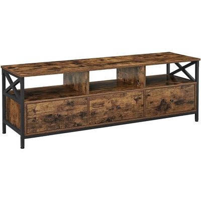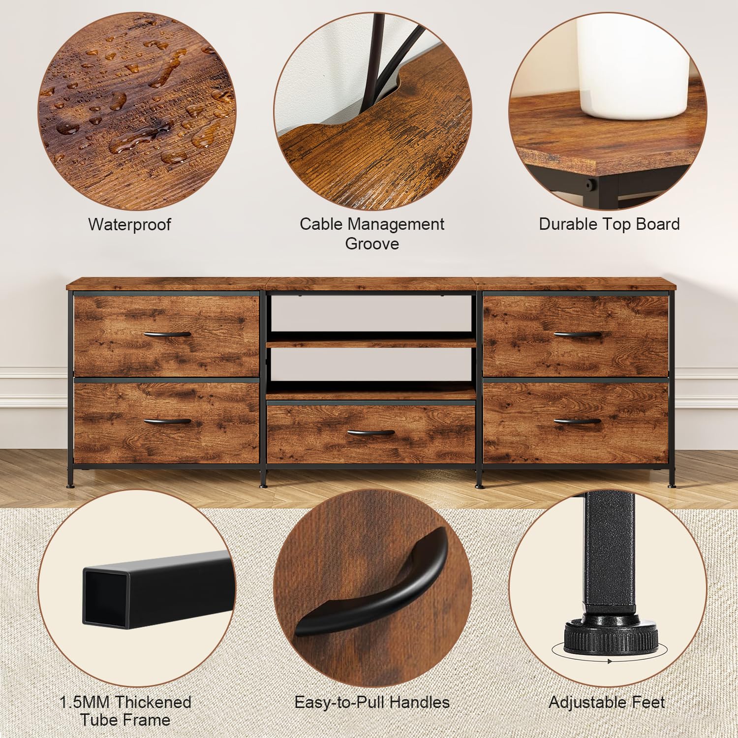 Etagere Rangement HOOBRO Meuble TV Avec Prises De Courant Jusqu'à 65 Pouces, Table Console TV Avec étagères De Rangement, Banc TV Industriel, Centre De Divertissement Multimédia Pour Salon, Chambre à Coucher, Marron Meuble Tv Bois Et Noir Ce meuble peut également servir de commode, buffet ou armoire de rangement, parfait pour le salon ou la chambre. MEUBLE TV - MEUBLE HI-FI - Meuble TV Noir 110,5x35x44 cm Bois de pin... Modulable, personnalisable, et disponible en plusieurs dimensions, le meuble télé s’adapte à votre intérieur, qu’il soit moderne, industriel ou classique Structure en métal et bois : Le meuble TV haut est constitué d'un cadre en métal solide et de panneaux de particules de haute qualité, assurant une utilisation durable. Un choix parfait comme meuble tv bois pour une installation facile et rapide. TJROO Meuble TV avec tiroirs chêne, fumée, 102 x 36 x 50 cm, bois multicouche, meuble Meuble multifonctionnel avec trou pour câbles : Un trou pour câbles au milieu du plateau permet de placer une console de jeu, un routeur ou d'autres appareils tout en dissimulant leurs câbles. Description du produit Banc TV Avertissement De Sûreté Attention : Ce meuble peut basculer s'il n'est pas correctement assemblé ou si des objets lourds sont placés sur les étagères du haut. Taille appropriée et support solide : Avec ses 8 pieds solides réglables, notre meuble TV en bois offre un support robuste et stable, même sur des sols inégaux. Idéal comme meuble TV chambre ou table télévision salon. Grand espace de rangement : Ce meuble télé industriel comprend 5 tiroirs en tissu pliables et 3 étagères ouvertes en bois, offrant un vaste espace de rangement pour vos appareils multimédias, DVD, consoles de jeu, lecteurs CD, récepteurs et box TV. Facile à nettoyer avec un chiffon humide/séché. Les patins sur chaque pied protègent vos sols des rayures. L'assemblage de ce produit peut être dangereux s'il n'est pas effectué avec précaution.