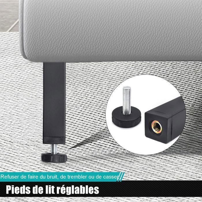 Nom du produit : Pieds de lit réglables Matériau du produit : acier laminé à froid Couleur : noir, blanc, noir mat Hauteur : Dimensions détaillées comme indiqué dans la figure 2 Taille des jambes : 3 cm x 3 cm Épaisseur de la paroi de la jambe : 1,2 mm Plage de hauteur réglable : 0-20 mm Caractéristiques : Facile à installer, épais et solide, forte capacité de charge, patins réglables Comprend : 4 pieds de support de lit, vis Les pieds de meubles réglables sont fabriqués en métal avec une surface peinte, une forte capacité de charge et une durabilité. Pieds de lit réglables, rétractables et robustes pour cadre de lit, pieds de support en métal, convient pour armoire, canapé, lit, pièces de rechange 17,8 cm à 33 cm Adaptés à la plupart des cadres de lit, les pieds de support du cadre de lit soutiendront et répartiront uniformément le poids d'un matelas lourd, protégeant efficacement votre lit et votre matelas de l'affaissement. C'est un outil idéal pour éviter que le lit et le matelas ne tombent et ne soient endommagés. Facile à installer : notre support de pied de canapé est livré avec des vis dans l'emballage, facile à installer, il suffit de fixer les pieds de support sous le panneau de lit avec des vis. Pied De Sommier à Lattes Argomaniz Jeu De 4 Pieds Pour Lit Gigogne, Sommier Partie Haute Et 2 Pieds Pliants Pour Sommier Partie Basse - Lit De 80 Cm, Avec Tube De Sommier 40 X 30 - Cuens Pieds Sommier A Lattes Si le cadre du lit comporte des trous, alignez les trous avec les supports et serrez les vis Note: 1., En raison des effets d'éclairage, de la luminosité de l'écran et des paramètres de contraste, etc. Conception réglable : notre cadre de support de lit adopte une conception réglable, qui peut être réglée en fonction de vos meubles pour obtenir la meilleure hauteur pour votre cadre de lit, et les meubles peuvent être facilement relevés ou abaissés en les faisant pivoter. Large application : les pieds réglables peuvent non seulement être utilisés comme pieds de lit, mais également comme pieds de canapé, pieds d'armoire, pieds de coiffeuse, pieds de table, etc. la tonalité de couleur de l'image du site Web peut être légèrement différente de la tonalité de couleur réelle. Lot de 4 pieds pour sommier cadre à lattes - Noir - APRANO de YSMÉE Matériau : les pieds de lit réglables sont fabriqués en acier laminé à froid, avec une surface peinte, une forte capacité de charge, pas facile à déformer, résistant à l'usure, solide, ferme, durable et peut être utilisé pendant une longue période. Adaptés à la plupart des cadres de lit, les pieds de support du cadre de lit soutiendront et répartiront uniformément le poids d'un matelas lourd, protégeant efficacement votre lit et votre matelas de l'affaissement
