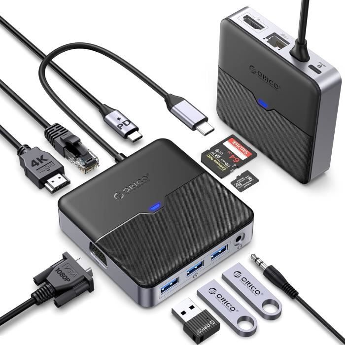 Hub USB 10 en 1 : le hub USB C Intpw combine parfaitement la plupart des fonctionnalités dont vous avez besoin, y compris Ethernet 1 Gbps, HDMI 4K, PD 100 W, USB-C et 2 USB-A 3., 2 10 Gbps, 2 ports USB 2., 0, SD/TF 2., 0., Remarque : les cartes SD et TF ne peuvent pas être utilisées en même temps Hub USB 10 en 1 : le hub USB C Intpw combine parfaitement la plupart des fonctionnalités dont vous avez besoin, y compris Ethernet 1 Gbps, HDMI 4K, PD 100 W, USB-C et 2 USB-A 3.2 10 Gbps, 2 ports USB 2.0, SD/TF 2.0. Remarque Design ergonomique en aluminium : le hub USB 3., 2 dispose d'un angle de 32 degrés et de tapis en caoutchouc qui vous évitent plus d'efforts lors du branchement et du débranchement de vos appareils USB et offrent plus de stabilité sur votre bureau. Charge rapide : utilisez le port de charge USB-C PD 100 W pour charger votre ordinateur portable et votre tablette de type C. La longueur du câble USB-C est d'environ 19,7. Hub USB C 10 En 1 Intpw P9 PRO USB C Hub 10Gbps, 9-in-1 USB C Docking Station With 4K@60Hz HDMI, Type-C & 2 Type-A 3.2, 2 USB-A 2.0, PD 100W, SD/TF Port,Aluminum USB Hub For Laptop Design Incliné Dissipateur Thermique Parfait pour votre travail, vos jeux et vos réunions d'affaires Pour une meilleure expérience, lorsque vous utilisez le hub USB, veuillez utiliser un bloc d'alimentation d'au moins 65 W pour charger votre ordinateur portable via hub. Large compatibilité : la station d'accueil USB C est compatible avec Windows, MacBook Air/Pro Series les plus récentes, iPad Pro, iPhone 16, Lenovo, Samsung, Dell et la plupart des appareils de type C. (Remarque : le port USB C hôte de votre appareil doit prendre en charge le Display Port Alt Mode Assez long pour connecter votre ordinateur portable Port de données USB 3., 0/2., 0 non recommandé pour le chargement Hub USB alienté intpw 10 ports USB 3.1 avec transfert de données 10