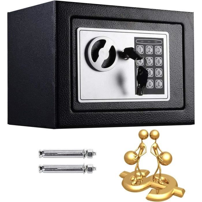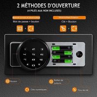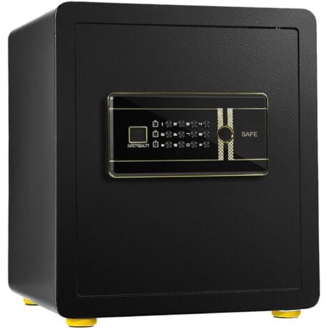 Caractéristiques : Boîtier en acier robuste et boulons anti-crochetages pour une excellente protection de sécurité Assez d'espace avec 1 étagère mobile et crochets pour ranger divers objets de valeur Coffre-fort avec un système d’alarme sécurisé pour empêcher le vol d’objets Vous pouvez configurer facilement 3 à 8 mots de passe selon le manuel Mot de passe anti-indiscrétion assure que personne d'autre ne verra le mot de passe Coffre-fort peut être alimenté par 4 piles AA (non incluses) ou des piles externes Spécification : Couleur : Noir Matière : Acier Dimensions du produit : 36,5 cm x 37,5 cm x 59 cm (L x l x H) Hauteur de l'étagère au fond : 10 cm - 24 cm Poids net : 23,7 kg Poids brut : 26,6 kg Livraison : 1 x Coffre-fort 2 x Clés principales 2 x Clés d'urgence 1 x Instructions Ne manquez pas ce garde du corps de sécurité ! Lorsque la batterie est faible, vous pouvez la remplacer ou connecter une batterie externe pour l’alimenter. De plus, il y a des crochets pour les clés derrière les portes. Vous pouvez définir de 3 à 8 codes pour ouvrir le coffre-fort en conjonction avec la clé principale. HEN--Coffre-fort numérique - Coffre-fort Petite Serrure à Combinaison... Coffre-fort de Sécurité Électronique avec code Clavier Numérique Vous n’avez plus à vous soucier du vol d’objets de valeur. Ce coffre-fort est parfait pour être installé à la maison, au bureau, dans un magasin. Design anti-indiscrétion & Large application : Ce coffre-fort dispose d'un mot de passe anti-indiscrétion, qui le protège des regards indiscrets malveillants. L'intérieur est équipé d'un petit coffre-fort avec un code individuel pour stocker les objets de valeur. Coffre Fort Sécurité Maison Bureau GOPLUS Coffre-fort Avec Serrure à Code électronique, Coffre-fort Avec Coffre-fort électronique Deux modes d'ouverture : code numérique personnalisable (3-8 chiffres) ou 2 clés de secours. Fonction anti-indiscrétion et alarme qui se déclenche après 3 codes erronés Lorsque le coffre-fort n’a plus beaucoup de batterie, vous pouvez utiliser une alimentation externe. Trois méthodes de déverrouillage, le système de sonnette d’alarme et le design anti-indiscrétion offrent plusieurs couches de protection pour votre propriété. Espace vaste et flexible : La taille du coffre-fort est de 36,5 x 37,5 x 59 cm, ce qui offre un grand espace. Le coffre-fort est fait d’acier de haute qualité, présentant une excellente durabilité, robustesse. En outre, les boulons anti-crochetages sont conçus pour offrir une sécurité supplémentaire à vos biens importants tels que l'argent, les bijoux, les documents, etc. Vous pouvez fixer le coffre-fort au mur pour gagner de la place.