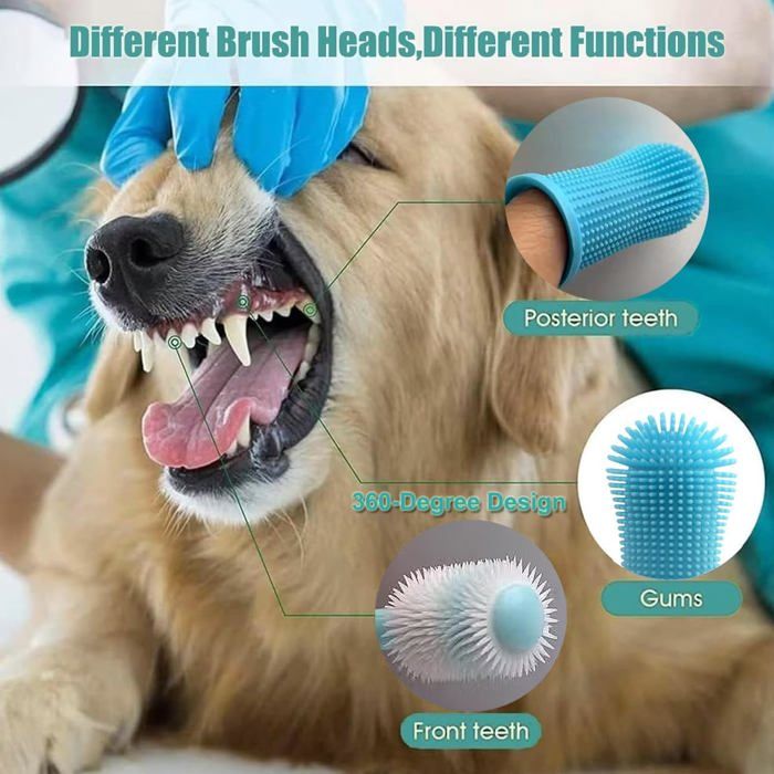 Ces brosse dent chien polyvalentes permettent un nettoyage buccal complet, luttent contre la mauvaise haleine et préviennent le tartre – pour des dents et des gencives saines sur le long terme - Le kit offre une flexibilité maximale : la brosse à dents pour chien à 3 côtés nettoie le haut, l'avant et l'arrière des dents en même temps, tout en économisant du temps. La brosse à dents pour doigts permet des mouvements contrôlés pour un brossage en douceur, en particulier pour les animaux anxieux. Réduit efficacement les problèmes dentaires tels que la parodontite ou les infections. 【Brosse à Doigt & Brosse Ronde】 Les brosses à doigt en polyester avec un design rainuré augmentent la friction pour un nettoyage plus intense – même contre la plaque dentaire tenace. Brosses Doigt Nettoyage 360° Chien Chat Brosses à Dents à Doigts Pour Chiens, 10 Pièces, Brosses à Dents Pour Kit Hygiène Buccale Chien Chat 【Brosse à Dents à Double Tête】 La grande tête nettoie minutieusement les dents antérieures, tandis que la petite tête atteint les zones difficiles d'accès comme les molaires. 【Promotion de la Santé Bucco-Dentaire】 Toutes les brosses sont fabriquées en matériaux haut de gamme et durables. 【Pour Animaux de Toutes Tailles】 Ce set comprend 1 brosse a dent chien pour triple face, 2 brosses à dents à double tête, 1 brosse à dents ronde et 6 brosses à dents à doigt. Ainsi, aucune zone n'est négligée Brosse à dents pour chien à 360° : notre brosse à dents adopte un design à 360° pour un meilleur contrôle que les brosses à dents traditionnelles, capable de nettoyer les zones que les brosses à dents ordinaires ne peuvent pas atteindre Description du produit : Le kit de brosses à dents RoyalChic pour animaux de compagnie offre une solution complète pour l'hygiène dentaire de votre animal. Idéal pour les chiens de toutes tailles et les chats. Idéale pour les gueules étroites ou les petites races de chiens. Ces brosses à dents pour animaux de compagnie conviennent aussi bien aux chiens qu'aux chats et aident à réduire la mauvaise haleine, la plaque dentaire et les infections. Ce kit dentaire complet comprend également 10 brosses à doigts, idéales pour un nettoyage des dents plus accessible, particulièrement pour les zones sensibles et entre les dents 10 pièces brosse à dents animaux - manchon doigt pour chiens Parfaite pour un brossage sans stress, même avec les animaux récalcitrants
