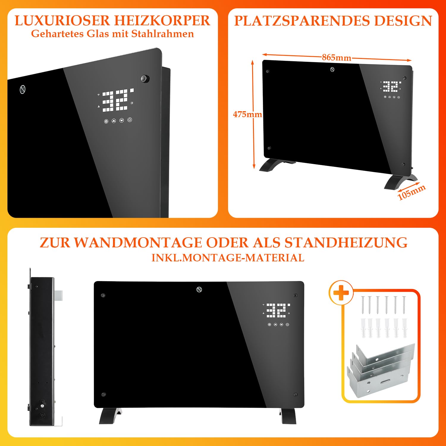 Minuterie intégrée de 24 heures. Capteur de température ambiante, réglable de 5 à 50 °C. Chauffage électrique convecteur - 40 m³ - Kiloutou Grand Sunchauffage infrarouge sur pied 900 à 2100 W En plus de la température, vous pouvez également régler la durée souhaitée et d'autres horaires. Radiateur électrique à convecteur en verre - Fonction WiFi - Avec Marquez, percez et insérez les chevilles fournies, puis vissez le dispositif de suspension, ou montez les pieds pratiques et utilisez-le directement sur une surface plane. Cela signifie que vous pouvez entrer dans une pièce chaude et confortable, même si vous le placez dans la salle de bain. Chauffage Soufflant Émetteur Thermique Cecotec ReadyWarm 2000 Thermal Connected 1500W 10 Éléments Wifi Télécommande Programmation Sécurité Enfant Radiateur Economique D'énergie électrique Thermostat électronique à capteur avec fonction anti-gel (5-7 °C) ; avec double protection contre la surchauffe et arrêt automatique pour plus de sécurité. Radiateur à convection double face de 2000 W : dissipateur thermique en aluminium combiné avec tube chauffant en acier inoxydable, chauffage rapide, air chaud uniformément réparti dans la pièce. verre trempé conduction thermique de grande surface pour atteindre le chauffage avant sur la sortie d'air et la double combinaison avant, chaleur élevée, chauffage rapide.