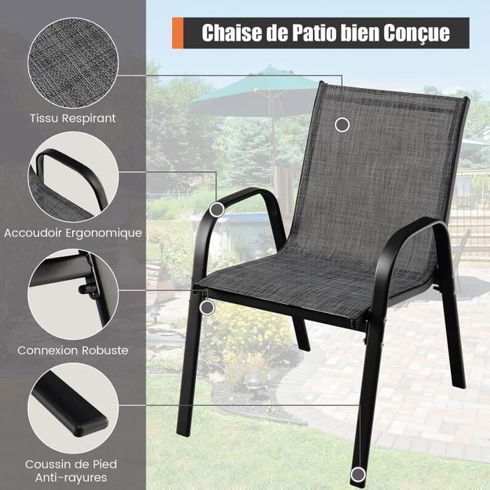 Dossier et Accoudoirs Ergonomiques - Pensé pour votre bien-être, notre chaises d'extérieur présentent un dossier incurvé et de longs accoudoirs, soulageant la pression sur la colonne et maximisant le confort grâce à un siège large. Profitez de moments de détente en toute tranquillité avec ce mobilier au style intemporel ! Avec un cadre métallique stable avec une finition résistante et un tissu respirant et résistant aux intempéries, ces chaises offrent à la fois le confort et la durabilité BEAU Chaises d'extérieures - Chaises de jardin lot de 2 Textilène et acier Noir anthracite... Structure Métallique Robuste - Avec un cadre en métal de haute qualité, cet ensemble de chaises de jardin garantit une stabilité accrue. GIANTEX Lot de 2 Chaises de Jardin Pliantes à Dossier Haut, Chaises de Assemblage et Nettoyage Faciles - Grâce aux instructions claires et aux accessoires fournis, assemblez vos fauteuils de jardin facilement. En plus, le tissu et le cadre imperméables vous permettent un entretien rapide avec un chiffon. Giantex Lot De 2 Chaises De Bureau Cantilever Ergonomique Avec Accoudoirs Chaises Visiteurs Cadre Metal Robuste Chaises De Reception Modernes Pour Bureau Reunion Conference Salle D’attente Noir Assise Confortable - Notre ensemble de 2 chaises de terrasse, avec son tissu de qualité, doux et respirant, offre un confort d'assise inégalé. Avec un tissu doux et respirant, un dossier ergonomique et une structure métallique robuste, ces chaises sont idéales pour l'extérieur. Leur polyvalence les rend parfaites pour la terrasse, le balcon ou le jardin, tandis que leur facilité d'assemblage et d'entretien vous simplifie la vie.