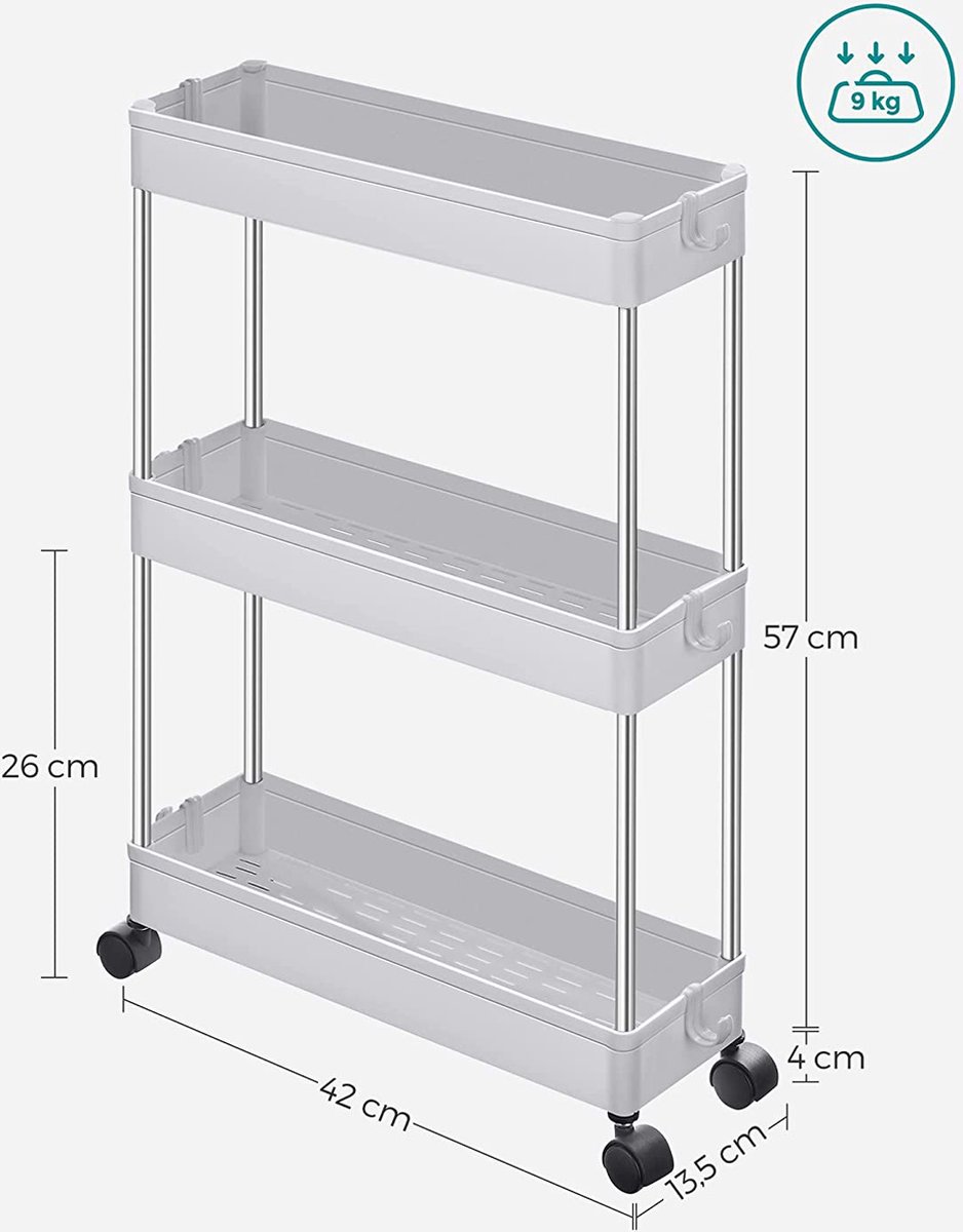 Étagère de rangement 3 niveaux avec paniers intégrés Les parois latérales surélevées des tiroirs empêchent les objets de glisser pendant le transport et augmentent ainsi la sécurité. Chariot De Rangement à Roulettes Danpinera Chariot à Roulettes étroit, Chariot De Service à 3 étages, Chariot De Cuisine Avec Séparateurs, Crochets Et Gobelets Suspendus, Chariot De Bricolage, Chariot De Niche Pour Peu encombrant : Avec une largeur de seulement 30,5 cm, ce chariot de cuisine s'insère sans effort dans les fentes étroites de la cuisine, les coins de la salle de bain ou sert de station snack compacte dans le salon (largeur d'installation minimale requise≥32 cm). Assemblage et assistance faciles:L'emballage comprend des instructions claires et faciles à suivre sur papier et des pièces triées à l'avance. À la réception du chariot, veuillez d'abord compter toutes les pièces à l'aide de la liste de pièces fournie. Chariot de service de plan de travail avec 3 étagères, roues, niche étroite, étagère chaude pour cuisine S'il manque quelque chose, contactez immédiatement notre service clientèle - nous vous proposerons une solution rapide et serons heureux de vous aider. La conception en grille ouverte offre une excellente ventilation, empêche l'accumulation de poussière et garde les articles au sec dans les zones humides. Polyvalent : ce chariot de rangement universel peut être utilisé comme aide de cuisine, solution de rangement dans le salon, système d'organisation dans la chambre à coucher, casier pratique dans la salle de bains, rangement dans le bureau ou rangement pour les fournitures de bricolage. 4 tiroirs + plan de travail multifonctionnel:Tiroirs en maille d'acier au carbone de haute qualité pour une organisation durable.