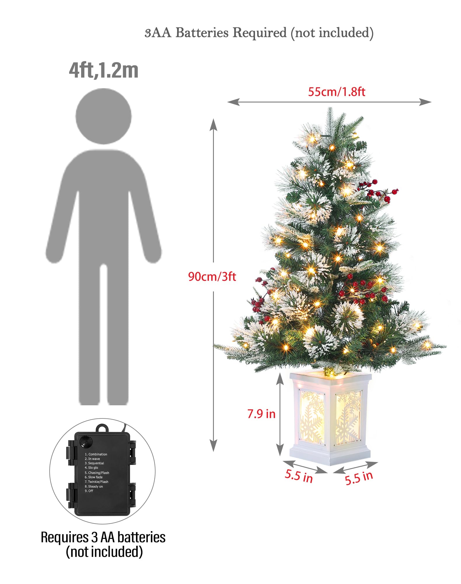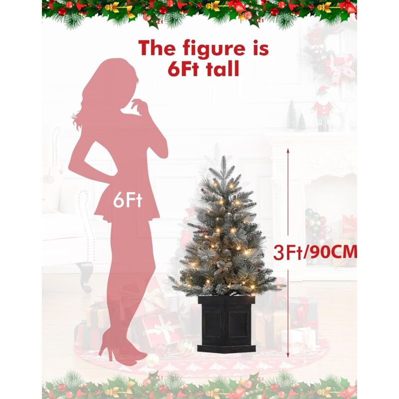 Socle rétro stable et montage facile : chaque mini sapin de Noël de 90 cm de haut tient fermement sur un pot en béton rétro robuste qui offre une stabilité supplémentaire et un look élégant. Minuterie pratique de 6 heures : pas besoin d'allumer et d'éteindre manuellement : l'éclairage s'éteint automatiquement après 6 heures et s'allume à la même heure le lendemain. Décoration de Noël idéale pour un plaisir festif durable - Ce sapin de Noël artificiel de 90 cm est doté de 78 LED blanc chaud, de feuilles vertes naturelles et de baies rouges, complété par un pied stable qui donne à votre décoration festive un aspect vif et enneigé Bebeboutik - COSTWAY Lot de 3 Sapins de Noël Artificiels 90-120-150 CM... Les branches prédécoupées sont faciles à aligner : déballez, insérez les piles et profitez immédiatement de l'atmosphère festive. Sapin de Noël blanc étincelant pré-éclairé de 2,4 m Facile d'entretien, réutilisable et durable - Idéal pour de nombreuses fêtes de Noël. Notre service client est à votre disposition à tout moment. 90cm Sapins De Noël Artificiels De 90 Cm Avec 78 LED Blanc Chaud - 8 Modes D Sapin De Noel Une solution pratique et économe en énergie pour un éclairage de Noël sans stress. Les lumières à économie d'énergie de 2700 K assurent une lueur chaude et confortable, même si les lampes individuelles tombent en panne. Fonctionne avec 3 piles AA (non incluses)