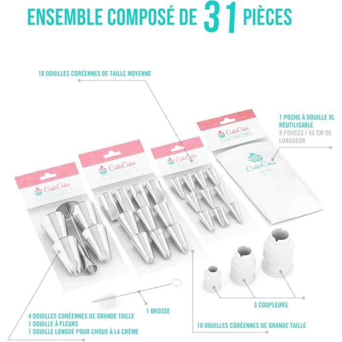 Matériaux sûrs et durables: Les douilles sont fabriquées en acier inoxydable 430 de haute qualité, résistant à corrosion et réutilisables. Les poches à douille sont en TPU alimentaire, et boîte de rangement est en PP sans toxines Idéal pour décorer des gâteaux avec précision et facilité Set Pâtisserie Poche à Pâtisserie Et Douille Kit Poche à Douille Pâtisserie - 24 Douilles Inox + Poche Coton Réutilisable - Décoration Gâteaux Poches à Douilles Douilles Inox 24 Pièces AiQInu Poche a douille patisserie 46 pcs,24 douilles en acier inoxydable, 2 poches à douille réutilisables en silicone, pour gâteaux, cupcakes, cookies, pâtisseries Rangement pratique et organisé: Le set est livré dans une boîte en plastique transparent avec trou pour accrochage. Parfait pour ranger vos poches à douilles et accessoires de manière ordonnée dans la cuisine 100 Grand Poches à Douille Patisserie,Transparent Sacs à Douille... 24Pcs Douille Poche à Douille Pâtisserie Kit Décoration de Gâteaux Ils sont lavables à la main ou au lave-vaisselle pour une utilisation durable Guide des motifs inclus: Une brochure explicative permet d’identifier facilement chaque douille selon son numéro. Les poches à douille sont en TPU alimentaire, et la boîte de rangement est en PP sans toxines.