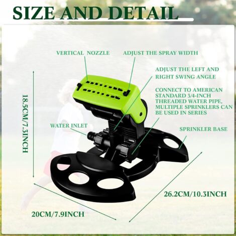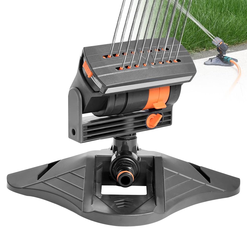 La buse scellée empêche les fuites et permet d'économiser l'eau. Système d'arrosage oscillant efficace : adaptez facilement la plage d'arrosage à vos besoins individuels, peut également être utilisé avec un minuteur d'eau Diivoo / débitmètres et d'autres produits de jardin pour maximiser les économies d'eau, garder votre pelouse/jardin luxuriant et vert Caractéristiques : ①Arroseur de pelouse durable fabriqué à partir de matériaux 100 % recyclés – Arrosage de jardin respectueux de l'environnement grâce au plastique recyclé durable, idéal pour les propriétaires de jardin soucieux de l'environnement. Système Plug & Play pour arrosage de la pelouse, raccordement rapide facile pour les tuyaux d'arrosage. Système d'irrigation oscillant de la pelouse, filtre métallique et buses souples permettent un nettoyage facile du calcaire. Une fois que la pression de l'eau augmente, l'arroseur tourne automatiquement et simule une pluie uniforme - Parfait pour les jardins de petite à moyenne taille. ③ Facile à installer et à nettoyer – Filtre en métal et buses souples pour éviter les dépôts de calcaire ; montage facile par clic sur les raccords sous-marins Caractéristiques : Nom du produit : 16 buses d'arrosage de jardin Dimensions du produit : 25 x 21 x 18 cm., Quantité : 1 lot. Arroseur de pelouse oscillant automatique 19 trous 4 modes Dispositif d Socle lesté stable - L'arroseur de pelouse avec tête en plastique ABS et pied lesté est sûr même en cas de forte pression d'eau (jusqu'à 4 bar). ② 4 types de jet réglables et portée de 8 à 18 m – Arrosage précis avec largeur de jet variable, distance de jet et débit d'eau pour chaque zone de jardin. En tournant simplement les buses marquées orange, vous pouvez ajuster la portée (jusqu'à 12 m) et la quantité d'eau – Idéal pour toutes les surfaces de pelouse. Fonctionnement sans effort : Mettez en mouvement cet arroseur de pelouse à large couverture d'un simple tour, automatisant ainsi votre routine d'arrosage et libérant du temps pour d'autres activités de jardinage Arroseur Automatique Arroseur Oscillant, En Plastique 3-4" Durable Pour Arroseur Pelouse Portée 18m Application : arrosage de jardin Poids : 580 g., Couleur : orange., Matériau : ABS.