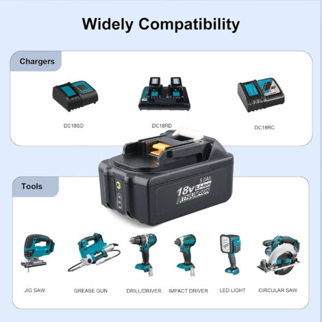 [ Pour 5000mAh ] 5,0Ah grande puissance pour Makita batterie, allonge les heures de travail de l'outil, fonctionne mieux que la batterie 4,0Ah, le choix de deux batteries peut être utilisé alternativement pour terminer le travail plus efficacement [ Pour BL1850B ] Capacité: 5000mAh, Tension: 18V, Type: Batterie Li-ion, Quantité: 2 packs, [ Pour les modèles compatibles ] Remplace la batterie pour Makita 18V BL1850B BL1850 BL1860B BL1860 BL1840B BL1840 BL1830B BL1830 BL1820 BL1815 BL1825 BL1835 BL1845 18V 4,0AH Verlängert Akku Für Makita BL1830 BL1840 BL1850 Li-ion Oder Ladegerät [ Pour les tests&certification ] La sécurité et la protection de l'environnement ont passé les certifications FCC, CE et RoHS. Compatible avec Makita 18V BL1860B, BL1860, BL1840B, BL1850, BL1840B, BL1840, BL1830, BL1830, BL183, BL1815, BL1825, BL1835, BL1845, 194205-3, 1944309-1, 1944204-5, 196363-0, 19667673-6, LXT-400 etc. Convient pour les chargeurs DC18RC/DC18RD 18V Remplacement Pour Makita Batterie Rechargeable 18V 5.0Ah Pour Makita Batterie Rechargeable 18v 50ah Pour Makita Bl1850b 18v Batterie De Remplacement Pour Makita Bl1860 Bl1840 Bl1830 Bl1820 Batterie Pour Makita Batterie 18v 2 Pieces 80911510 Le Makita 4er Set BL1850B 18V 5Ah est idéal pour les utilisateurs fréquents, tandis que le lot de 2 batteries de rechange BL1850B garantit une longue durée d’utilisation