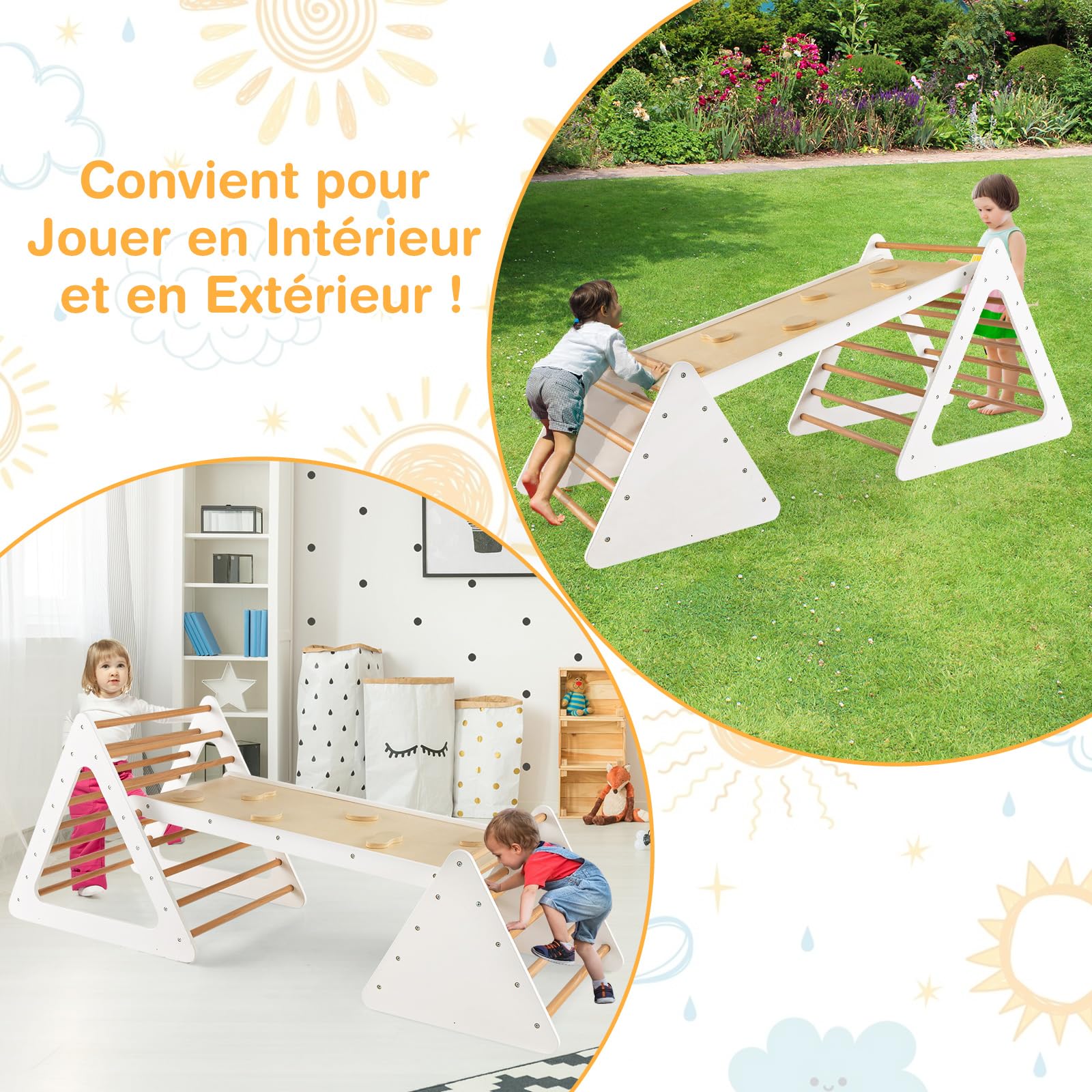 Triangle D’Escalade Montessori Pliable Avec Rampe Double Face Échelle Triangulaire Avec Hauteur Réglable Pour 3 Ans+ Naturel/Coloré