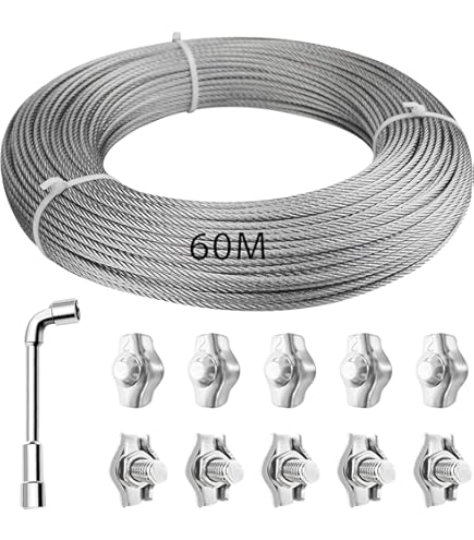 Câble acier gainé en PVC Campbell, Acheter Vos Câbles Métallique avec Innovtools 【PVC Coated】 : L'épaisse couche de PVC de serre cable acier protège contre la rouille, les rayons UV et l'abrasion, ce qui est idéal pour une utilisation en extérieur. Kit Gainé 50m Cable Acier 2mm, Fil A Linge Extérieur, 67 Pcs Kit Cable Inox 7x7 PVC Gainé Avec 4 Tendeur, 20 Boucles Sertissage, 10 Cosses Cable, 10 Serre Câbles Acier, 4 Crochets Muraux Câble Acier 【30m de câble d'acier flexible】 : Comprend 30m de câble métallique enduit de PVC (2mm/3mm OD) avec une âme intérieure pour un enroulement facile et un stockage sans enchevêtrement. Construit pour résister à des années d'utilisation intensive sans rouiller ni s'affaiblir. 【Indoor & Outdoor】 : corde a linge sont parfaits pour le jardinage (treillis, vignes), les projets de bricolage (accrochage de photos/miroirs), les tentes, les cordes à linge et l'éclairage extérieur. SET 30 cable 2 acier inox cordage torons: 7x7 6 serre-câbles étrie 2 tendeur oeil-crochet... Câble acier gainé en PVC Campbell, Acheter Vos Câbles Métallique avec Innovtools L'âme en acier renforce la durabilité tout en maintenant une flexion douce pour une utilisation polyvalente. Elle offre une surface lisse et sans accroc qui ménage les mains et n'abîme pas les objets suspendus. L'ensemble est livré avec 20 manchons en aluminium, 10 pinces à câble, 10 cosses à câble, 4 tendeurs, 4 mousquetons, 4 crochets, 16 vis, 1 clé à douille.