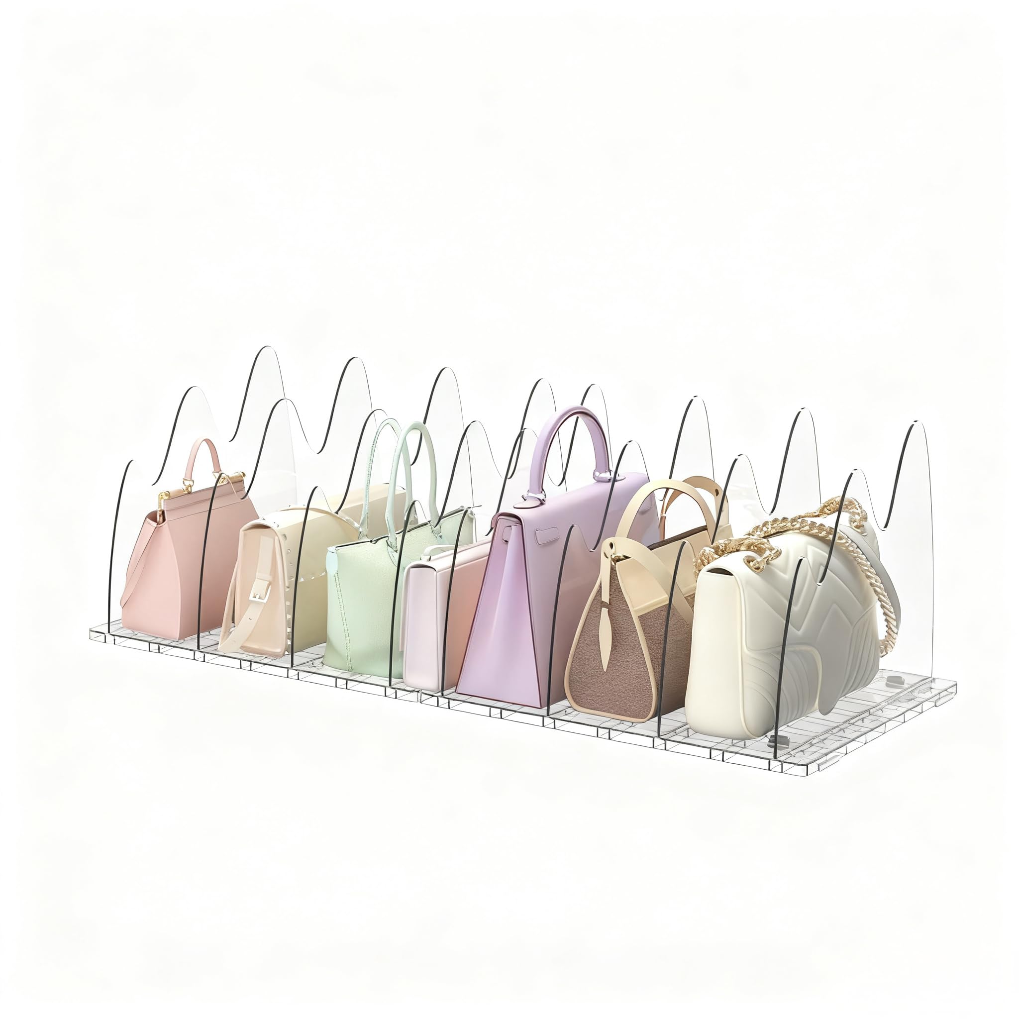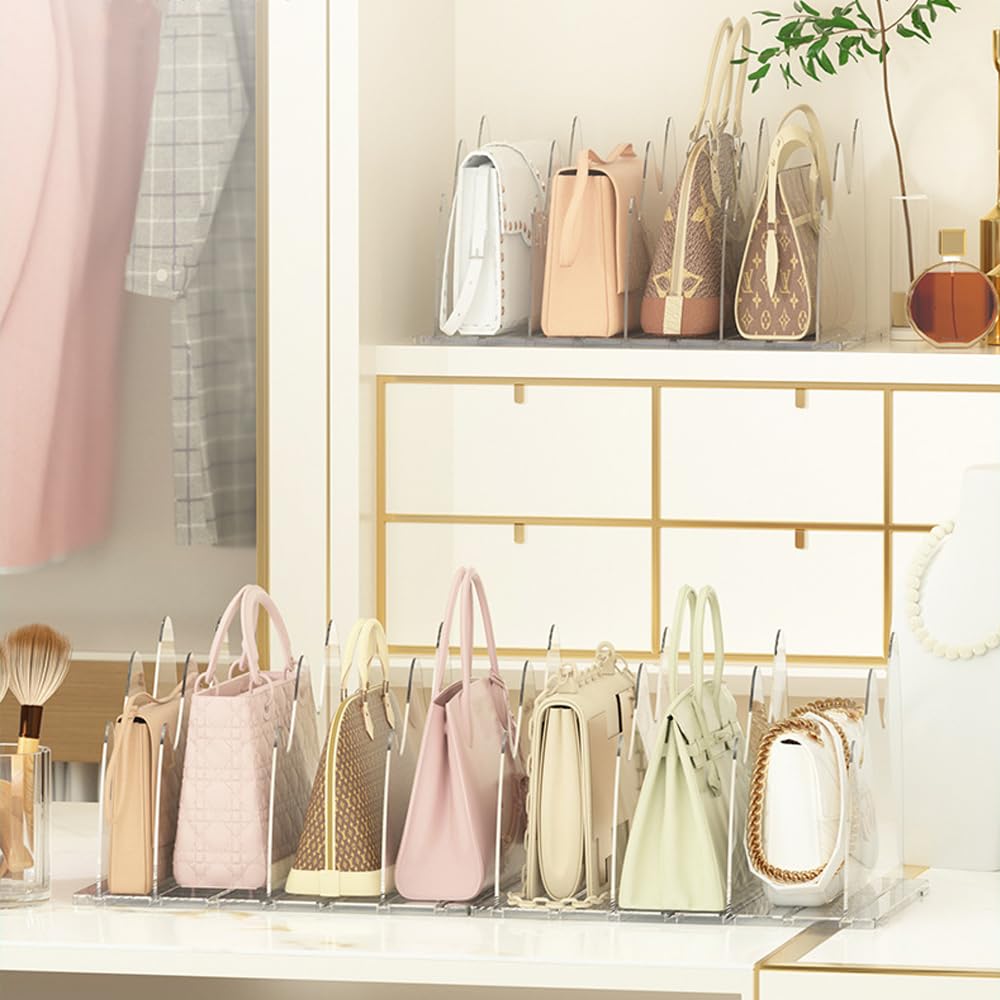 Rangement Sac Séparateur D'étagère De Placard U2013 Séparateurs De Rangement Transparents Pour Sacs De Rangement Sac A Main Rangement Dressing NZZVNZ 8 Pièces Separateur Etagere, 28 X 20CM Transparent SéParateurs D' éTagèRes En Acrylique, Organisateur Armoire Vetement Pour Sacs à Main, Vêtements Et Livres Separation De Piece Utilisation polyvalente : cet organisateur d'étagère de placard est parfait pour ranger des sacs à main, des pochettes, des petits sacs, ainsi que pour organiser des livres, des fichiers au bureau, des ustensiles de cuisine dans la cuisine ou des produits de soins de la peau dans la salle de bain. Séparateurs réglables : les séparateurs d'étagère réglables s'adaptent à une variété de tailles de sac, permettant à chaque sac d'avoir un espace de rangement approprié, pratique pour un accès quotidien et toujours le garder bien rangé. Le démontage est également simple pour garantir un réglage pratique du séparateur. Sac à Main Transparents avec Lettres Imprimées - Sac de Jour Gardez les sacs droits : cet organisateur de sac à main pour placard maintient vos sacs droits et bien debout plutôt que de les entasser. Combinez de manière flexible pour s'adapter à votre espace : l'organisateur de sac à main pour placard dispose de 2 bases et de 8 séparateurs ; connectez les bases ou utilisez-les séparément pour tirer le meilleur parti de votre espace de placard Vous pouvez trouver le sac à main que vous voulez sans fouiller dans une pile. Installez simplement les séparateurs dans la base à la réception du produit.