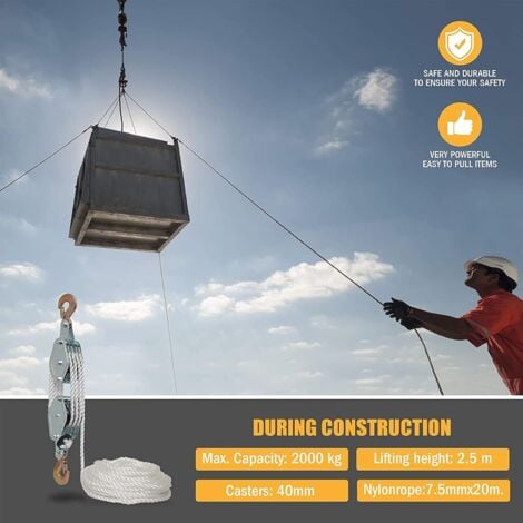 Crochet pivotant à 270° : Ce crochet est facile à utiliser et réglable, et pivote à 270° sans se bloquer. Palan manuel Proplus pour 180 kg avec corde de 20 mètres Grande capacité de charge : Ce moufle est doté d'un câble en nylon de 20 mètres et d'un câble de 7,5 mm de diamètre, vous permettant de soulever des objets lourds jusqu'à 2,5 mètres. La poulie, de type crochet, facilite le levage et peut être réglée manuellement. Il est également idéal pour une utilisation en extérieur, comme le camping ou l'entretien des arbres. La fonction pivotante à 360° rend le crochet encore plus flexible. Moule 8:1 : Ce moufle robuste est doté d'une technologie de roulements métalliques et de crochets en acier, réduisant votre charge de travail de 87 % ! Palans Levage Lourd Palan à Corde 2000 Kg - Poulie De Levage Le crochet de sécurité en acier maintient fermement les poulies en place, garantissant un fonctionnement sûr. Il est équipé de quatre poulies en nylon résistantes à l'usure de 40 mm de diamètre, renforcées pour éviter toute torsion. Moule de sécurité : Fabriqué en polyéthylène multibrins, ce moufle a subi des tests rigoureux. DEWINNER Palan à chaîne Manuel 2T avec Crochet Robuste, Hauteur de... Palans Levage Ratio 8:1 Palan Manuel Poulie De Levage 1000kg Système 8:1 - Bloc Métallique Avec Corde Polypropylène, Pour Chantier/garage Treuil Electrique 12v Tire Fort Idéal pour les ateliers, les chantiers ou le transport.