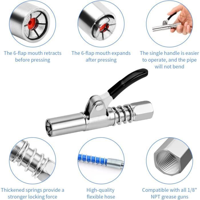 【Poignée double】L'embout pompe a graisse est conçu avec deux poignées pour une utilisation facile d'une seule main et moins d'effort lors de l'huilage, et la délicate poignée antidérapante rend l'utilisation plus facile et plus sûre 【Contenu de l'emballage】Vous recevrez 1 raccord de pistolet à graisse et un tuyau de 30 cm pour vous aider à vous débarrasser de la lubrification désordonnée, encombrante et inefficace et éviter les fuites et le gaspillage 【Facile à utiliser】Après avoir appuyé sur l'embout pompe a graisse, la buse à 6 mâchoires se déploie vers l'extérieur et se bloque en place. 【Large éventail d'applications】Graisseur pompe a graisse pour graisseurs M6 / M8 / M10 / M12/M14, compatible avec tous types de pompes à graisse (pneumatiques, manuelles et électriques), convient pour le blindage des arbres d'hélices, des arbres, des moissonneuses, des joints en U et autres graisseurs encastrés Technologie innovante permet à l'embout pompe a graisse de se bloquer et de se débloquer plus rapidement et plus facilement, même sous forte pression, avec une pression de travail maximale de 10 000 psi, ce qui rend l'injection de graisse plus efficace et plus pratique Embout Pompe Graisse Tuyau 30cm Raccord De Pistolet à Graisse Coupler G Pour Pompe à Graisse Embout Graisseur EBOUT POPE A GRAISSE Lot De 28 Adaptateurs De Pistolet à Graisse - Coupler G - Avec
