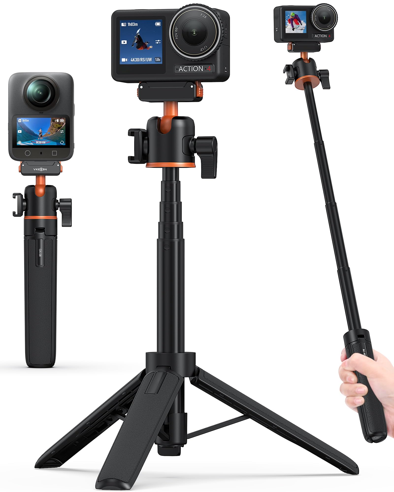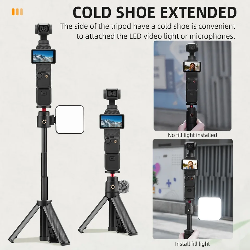 Compatible avec Osmo Action 5 Pro, Action 4 et Action 3, Osmo 360, Osmo Nano. Compatibilité : DJI Osmo 360, Osmo Action 5 Pro, Osmo Action 4, Osmo Action 3 Perche à selfie extensible 1.50 m DJI pour gamme Osmo Action 3 et 4 120cm Bâton Selfie Trépied, Poignée Extensible pour Caméra d Utilisez-le comme poignée Vlog, rallonge ou trépied de bureau – parfait pour votre créativité stimulée. Ajustez la hauteur selon vos besoins pour faire preuve de créativité avec vos photos. Sa tête sphérique permet un panoramique horizontal à 360° et une inclinaison verticale à 90°, vous donnant une couverture complète pour clouer n'importe quel coup, quelle que soit la scène. Le mini trépied Osmo Action est construit avec une tige d'extension à 4 sections, il s'étire jusqu'à 54 cm. Dji Osmo Action 5 Pro Mini Perche à Selfie Trépied 54 Cm Pour /4/3, Osmo Accessoire Dji Osmo Action 4 Ce mini trépied est conçu pour les caméras d'action DJI Osmo et dispose d'un montage magnétique à dégagement rapide. Confortable à tenir pendant une longue période lors de la prise de vue de sports récréatifs ou de vlogs. Le design à rotule sur le dessus rend le réglage de l'angle rapide et pratique.