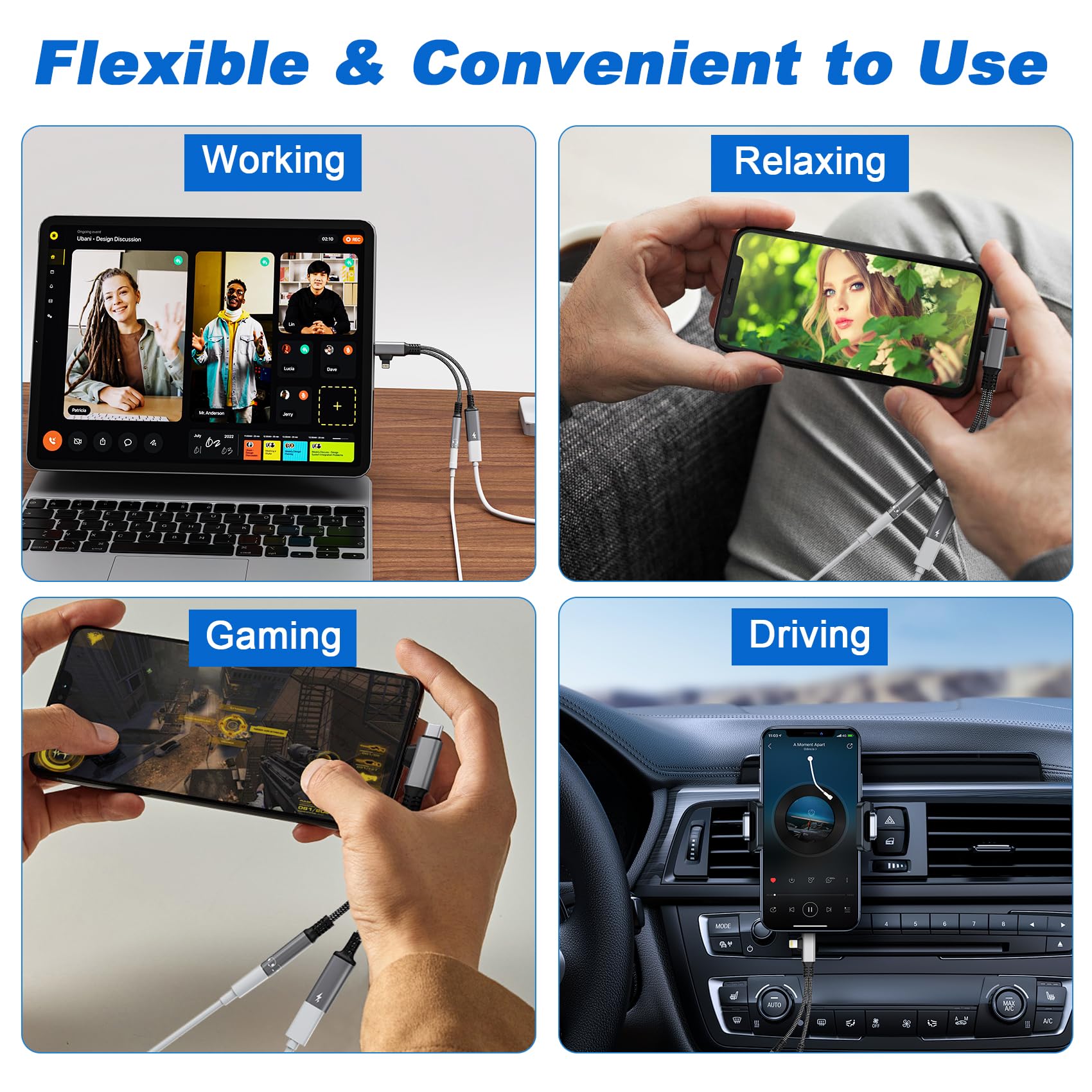The iphone aux adapter is widely compatible with iPhone 14/14 Plus/14 Pro/14 Pro Max/13/13 Pro/13 Pro Max/12/12 Pro etc. 【Fast Charging and HIFI Audio Playing】L'adaptateur iPhone/USBC vers aux et charge prend en charge la charge PD 60W pass-through et l'utilisation longue durée pour charger rapidement votre appareil. Splitter USB-C Jack Audio Apple MFi Certified] Adaptateur Lightning Vers 3.5mm Jack, 2 En 1 Adaptateur Casque PD 60W Charge Rapide Hi-Res Audio Charge Adaptateur Câble Pour IPhone 14/13/12/11/X/8/Pad/i-OS Dongle Audio IPhone 16 15 14 Magnétique Adaptateur USB C + Lightning vers Jack 3.5mm 2 en 1 Le port USB C est compatible avec iPhone16/16 Plus /16 Pro/16 Pro Max/15/15 Plus/15 Pro/Samsung GalaxyS23 S23+ S23 Ultra S22, etc. L'adaptateur USBC/iPhone pour prise casque est fabriqué à partir d'un tissu très résistant, qui a passé plus de 20 000 fois le test de flexion, il est beaucoup plus durable et robuste que l'adaptateur usb c à jack audio ordinaire, et il est doux et sans enchevêtrement ! Le séparateur iphone pour la charge et le casque présente un design innovant en « L » à 90 degrés qui empêche toute déconnexion accidentelle et facilite l'utilisation latérale de votre téléphone, comme jouer à des jeux ou regarder des vidéos. 【Apple MFi Certified】L'adaptateur aux à iphone avec connecteur de câble auxiliaire a une puce certifiée Apple MFi intégrée pour assurer une compatibilité parfaite avec votre appareil sans faire apparaître de messages d'erreur. Aazon.co: OGOOD Adaptador USB C a doble USB C hebra, 2 puertos, no... L'adaptateur USB C vers prise casque adopte une puce de décodage DAC intelligente pour prendre en charge une sortie sans perte jusqu'à 24bit 48kHz afin d'assurer la stabilité et la fidélité de la transmission du son. iPhone headphone and charger adapter support dual ports at the same time to charge your phone while listening to music. The headphone jack to usb c supports call function, charging, headphone control, data transfer, microphone and remote control.