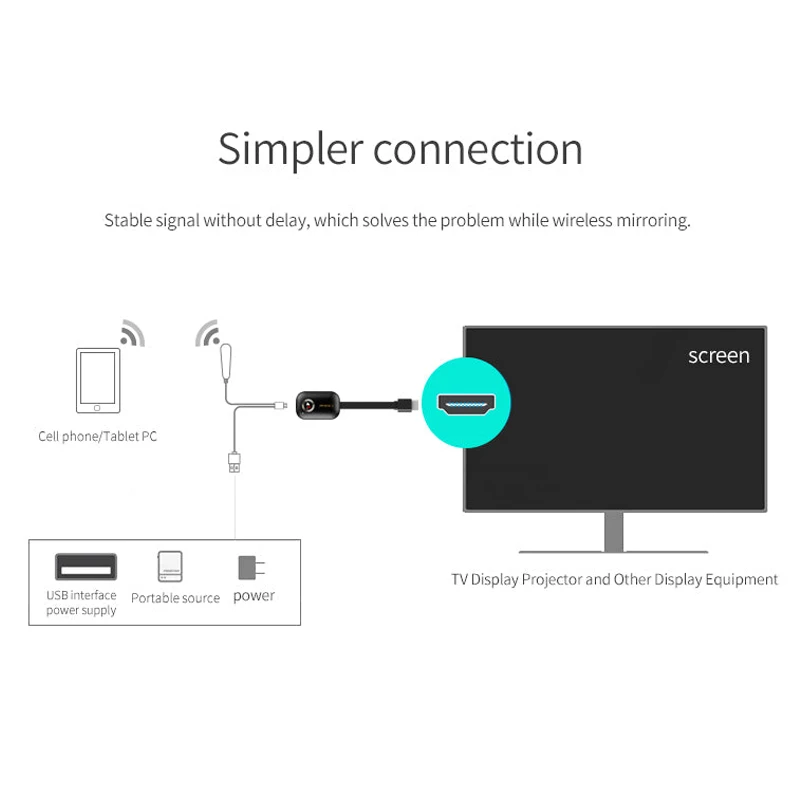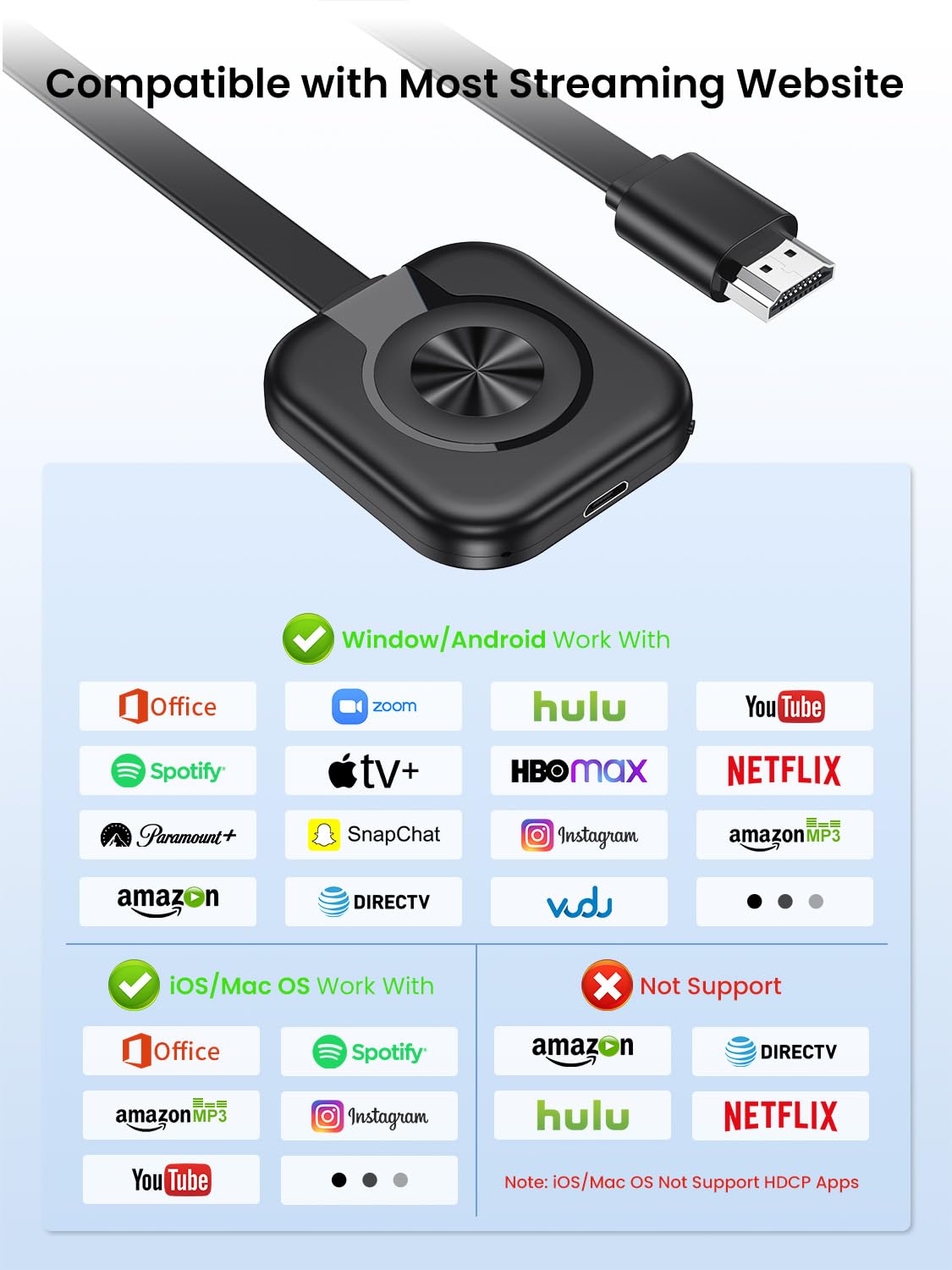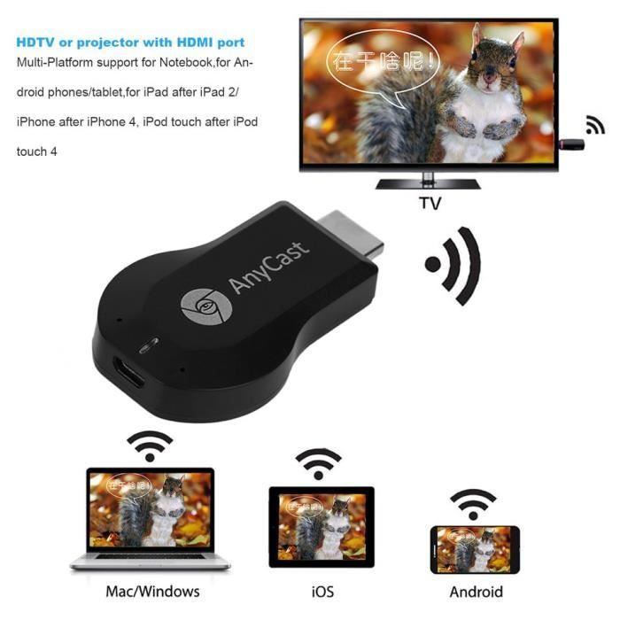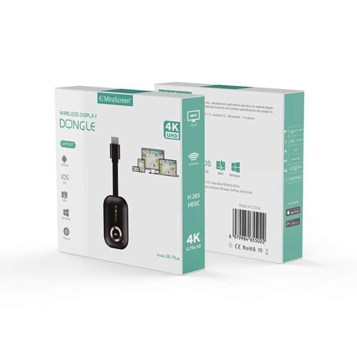 Design compact, portable: Avec son format léger et peu encombrant, ce miracast HDMI dongle se transporte partout. Dongle d'affichage WiFi sans fil - Récepteur d'affichage sans fil WiFi 5 GHz 2,4 GHz... Cet 1080P wireless display adapter permet de projeter facilement du contenu professionnel, ludique ou éducatif sur grand écran. Spécifications : Nom du produit : Dongle HDMI Sans Fil Couleur : Noir Support de stockage : Mémoire flash Interface : HDMI Résolution de sortie : 1080p Formats audio : MP3, WMA, WAV, OGG, FLAC, DTS, AAC, APE Formats vidéo : AVI, MPEG, DAT, RMVB, WMV, FLV, MP4, ISO Langues du menu : Chinois, Anglais Fonctions : Sans fil, Bluetooth, Wi-Fi, Jeux, Vidéo à la demande, Affichage HD, Lecture locale, Duplication d'écran Cet miracast HDMI dongle est idéal pour regarder des films, partager des photos ou projeter des présentations avec une clarté époustouflante et une fluidité sans compromis. Chromecast Google Tv Dongle HDMI Sans Fil 4K, Récepteur D’Affichage WiFi Bi-Bande Compatible Android IOS Windows Cet adaptateur HDMI sans fil est idéal pour les appels vidéo, le streaming en temps réel et les sessions de jeux exigeantes sans coupures gênantes. Wireless HDMI Display Adapter,Adaptateur d'affichage HDMI sans Fil WiFi Récepteur Dongle 4K Conception Plug and Play: La mise en route est simple et rapide : branchez le dongle HDMI sur votre téléviseur ou projecteur et connectez-le à votre réseau WiFi. Diffusion d’écran 4K Ultra HD: Profitez d’une qualité d’image claire et détaillée grâce au dongle HDMI sans fil, qui prend en charge la résolution jusqu’à 4K Ultra HD.