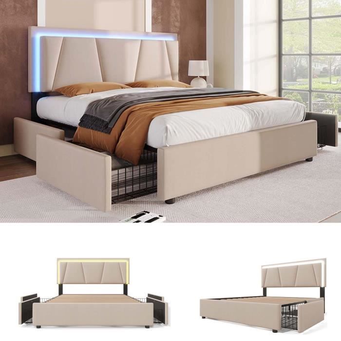 Le lit peut supporter jusqu'à 350 kg, assurant un confort et une stabilité optimaux. Veuillez noter que le lit est livré en deux colis et qu'il peut arriver à des dates différentes. Lit Rangement Petit Espace Cadre De Lit 160x200 LONELYO Lit 160x200 Avec Sommier LED Et USB, Rangement Et Tiroirs U2013 Lit Coffre Moderne En Lin Beige Pour Adolescents Lit Coffre 160x200 Tête De Lit LED Espacement de la tête de lit : 25 cm. Rangement : Ce lit offre un espace de rangement pratique. Matériaux : Bois massif + métal + lin. Dimensions : 217,5 x 145 x 165 x 126 cm. Montage facile : Le lit est livré avec une notice de montage et tous les outils nécessaires. Description du produit Description du produit : Un lit double moderne avec rangements, redéfinissant le sommeil intelligent. Lit avec tiroirs 160x200 cm - tête de lit avec port de charge USB/Type-C et Veuillez patienter jusqu’à la réception de l’ensemble complet., 3., Pour toute question, veuillez contacter notre service client ; nous y répondrons dans les plus brefs délais. Notre service client est toujours disponible pour répondr20à vos questions. Tête de lit USB/C : Dotée d'effets lumineux RVB, elle diffuse une douce lumière, idéale pour lire ou regarder la télévision. Ce matelas est doté d'un linge frais et respirant pour un confort inégalé. Caractéristiques : Couleur : Gris. Avertissement De Sûreté Ne pas charger plus de 350 kg. Linge de haute qualité : Le linge du matelas est doux et confortable, réduisant efficacement les risques de blessures dues aux bords et aux angles vifs. Quatre tiroirs sous le lit sont équipés de roulettes pour une mobilité optimale. Elle est également équipée de ports USB et Type-C, facilitant ainsi la recharge de vos appareils électroniques. Le lin respire facilement et offre une agréable fraîcheur, vous permettant de vous endormir profondément.