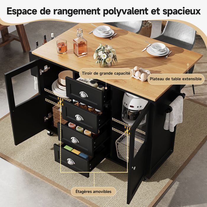 Avec poignées métalliques, porte-serviettes intégré et étagère à épices, ce meuble allie design contemporain et fonctionnalité pratique. Îlot central à roulettes - 130 x 45/75 x 92 cm - desserte extensible EN STOCK : Îlot de cuisine mobile sur roulettes avec table à manger extensible, desserte de cuisine avec porte-verres à vin et espace de rangement (noir) pas cher - Retrait & Livraison - Paiement 4X disponible. Meuble de cuisine à prix discount 【Tiroirs pratiques】 La conception innovante comprend un tiroir à couverts spécial de 8 cm de hauteur et un grand tiroir avec des glissières silencieuses pour un fonctionnement en douceur. La partie centrale abrite un grand espace de rangement avec des étagères réglables. Desserte en Inox Roulante avec 2 étagères 【Style et qualité】 Fabriqué en panneau de fibres de densité moyenne avec une surface mélaminée résistante et hydrofuge pour un entretien facile. 【Mobilité facile et sûre】 Cinq roulettes (dont deux verrouillables) permettent un déplacement flexible et un positionnement stable, ce qui le rend parfait pour les cuisines, les salles à manger ou les salons. îlot Noir Pratique Îlot Central Mobile Avec Plan De Travail Extensible + 2 Tiroirs + 4 îlot Cuisine Mobile Noir