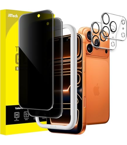 [Matériau de Qualité Supérieure] Fabriqué en verre trempé haute dureté 9H. [Anti-Empreintes Digitales] Le revêtement hydrophobe et oléophobe empêche efficacement les résidus d'empreintes digitales, d'huile et de filigrane de s'accumuler sur l'écran JETech Lot de 3 films protecteurs d'écran pour iPhone 17 Pro Max 6,9", installation facile en une seule étape avec boîte auto-alignement sans bulles, film en verre trempé 9H, HD transparent [Installation Super Facile] Il suffit de placer votre téléphone à l'envers sur l'outil d'alignement, de retirer la languette de traction, et le protecteur d'écran s'aligne automatiquement pour une adhérence rapide et sans bulles Conçu avec des bords incurvés 2,5D bien pensés, compatible avec la plupart des coques de téléphone ESR Verre Trempé pour iPhone 17 Pro Max, Protections D'écran de qualité militaire, dureté 9H,Incassables, Couverture Complète, avec Plateau UltraFit, Lot de 3 [Ultra HD & Haute Sensibilité] Vous offre une expérience de visionnage ultra HD. Veuillez vérifier le modèle de votre appareil avant l'achat. Protection écran Iphone 17 Pro Max JETech Protection D'écran Pour IPhone 17 6,3 Pouces, Installation Verre Trempé Iphone 16 Pro Max