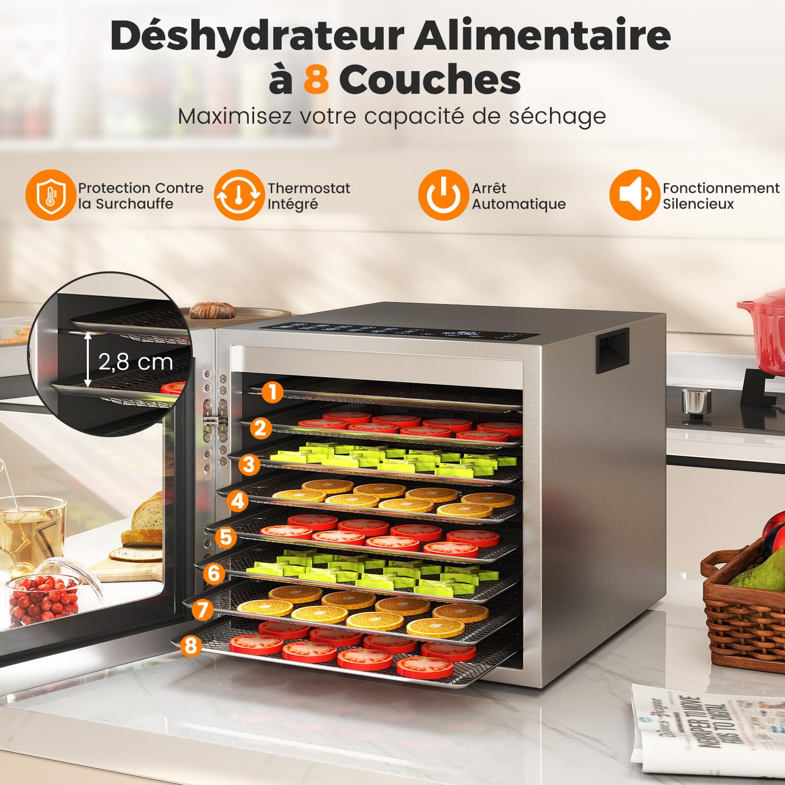 Légumes : 50-60 ℃/122-140℉, 5 heures. L'appareil est équipé de 6 niveaux de grande capacité pour répondre aux besoins des différents ingrédients. Pieds antidérapants : augmentent la friction entre la machine et le plateau de table, empêchant le produit de glisser pendant l'utilisation quotidienne. Construit pour durer : la machine électrique de séchage des aliments est fabriquée en acier inoxydable 201 résistant à la corrosion qui conserve son aspect argenté élégant à travers des années d'utilisation quotidienne et résistant à la rouille et à la déformation Taille de l'emballage: 34 * 34 * 27cm Poids brut: 5kg Poids net : 4,75 kg Contenu du packaging : 1 déshydrateur alimentaire électrique. Séchoir à linge pliable à 4 niveaux réglable en acier inoxydable avec 4... Tension: 220V Puissance: 400W Montage requis: Oui Type de montage : installation libre, plateau de table. 1 livre de recettes anglais., Avertissements : 1., Veuillez vérifier attentivement la taille avant de commander., 2., Veuillez permettre une légère différence de couleur en raison de la lumière de prise de vue et de 1 à 3 cm d'erreur due à la mesure manuelle et assurez-vous que cela ne vous dérange pas avant de commander. Plateau anti-goutte : recueille les gouttes de graisse et d'eau de la nourriture pendant le processus de séchage, évitant ainsi la pollution à l'intérieur de l'appareil. Dimensions totales du produit : 30 x 29,5 x 23,5 cm. Sèchoir Biosec de luxe en acier inoxydabe avec 6 paniers Description : Avec cette machine électrique de séchage des aliments, vous pouvez créer vos propres collations saines à la maison. Viande : 80-85 ℃/176-185 ℉, 6 heures. Dimensions des plateaux individuels : 28 x 20 cm. En outre, ils évitent les rayures et les dommages sur le plateau de Clip de nourriture : permet d'éviter tout contact direct avec des aliments chauds ou des plateaux de nourriture pour éviter les brûlures. Déshydrateur Inox 400W Déshydrateur à 6 étages En Acier Inoxydable Avec Régulateur De Tepérature, Inuteur LCD, 6 Bols Alientaires, 1 Bac D'égoutteent Et 1 Pince Alimentaire Fr Fr Déshydrateur électrique Numérique 400W Sûr et silencieux : la machine de séchage des aliments fonctionne à un murmure silencieux de 50 à 60 dB tandis que la protection intégrée contre l'arrêt automatique et la surchauffe maintient la cuisine sans stress en éteignant automatiquement une fois que les collations atteignent la parfaite sécheresse Spécifications: Couleur: Argent Matériau : acier inoxydable 201., Modèle: LT-28 Nombre d'étages : 6., Type de fiche: norme UE Bruit: 50-60dB Plage de réglage du temps: 0,5-24 heures Plage de réglage de la température: 30-85℃/86-185℉.