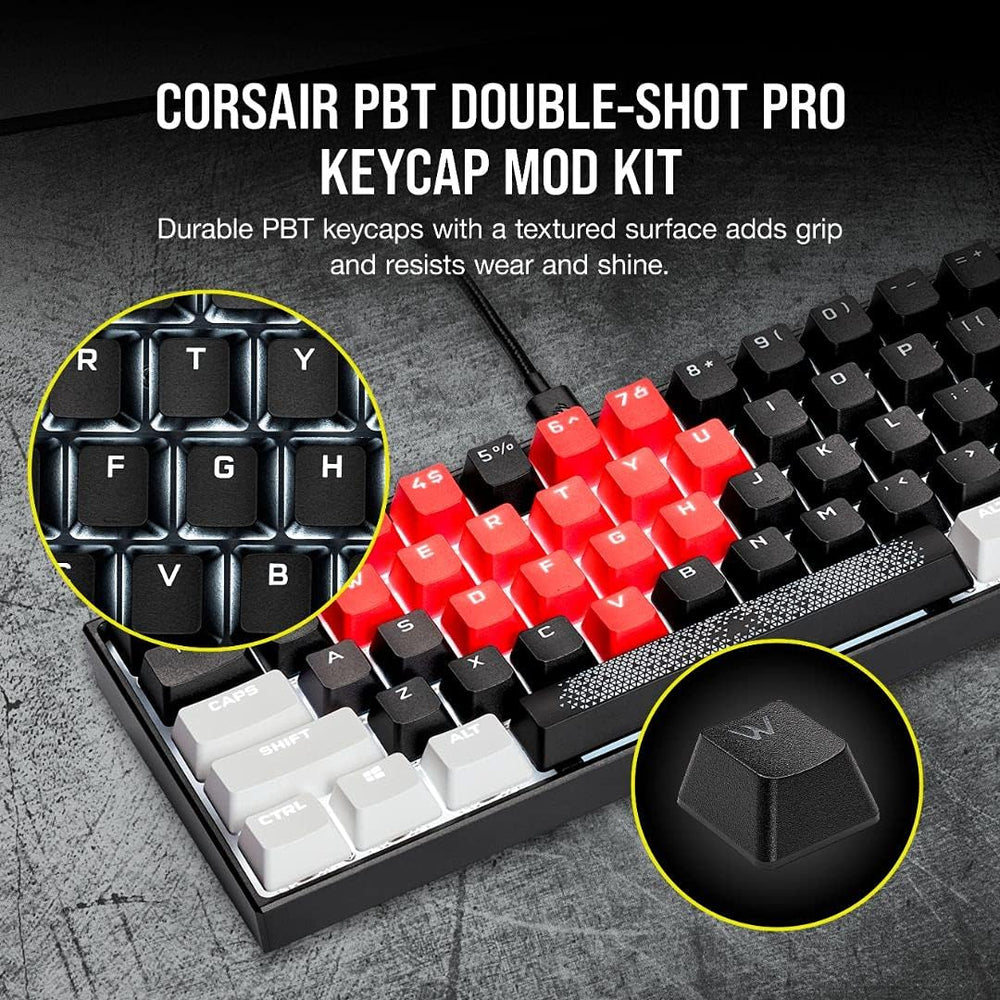 Un large éventail de couleurs : Disponible dans plusieurs couleurs chatoyantes afin que vous puissiez choisir votre esthétique et personnaliser votre clavier. Amortisseurs toriques inclus : En silicone, ils adoucissent les frappes pour une expérience de gaming ou de travail plus silencieuse et agréable. Corsair PBT DOUBLE-SHOT PRO Kit de Modification de Touches (Touches PBT à Double Injection, Rang Inférieur Standard, Surface Texturée, Épaisseur de 1,5 mm, Amortisseurs Toriques Inclus) Onyx Noir | Votre wishlist sur Pour une durabilité élevée et une variété de couleurs chatoyantes, personnalisez votre clavier comme un pro avec le kit PBT DOUBLE-SHOT PRO Le large choix de couleurs éblouissantes accentue l’esthétique de votre bureau tandis que les amortisseurs toriques facultatifs inclus adoucissent les frappes pour une expérience de gaming ou de travail plus silencieuse et agréable. PBT DOUBLE-SHOT PRO Keycap Mod Kit - Onyx Black (DE Disposition avec rang inférieur standard haute compatibilité : Le set est compatible avec tout clavier mécanique MX et clavier mécanique optique CORSAIR ayant un rang inférieur standard. Les touches à double injection PBT rigides de 1,5 mm d’épaisseur ont une surface texturée résistant à l’usure, à la décoloration et à l’effet de brillance et offrant une stabilité et une adhérence exceptionnelles. Kit De Teclas Corsair Pbt Double-shot Pro Elgato Blue