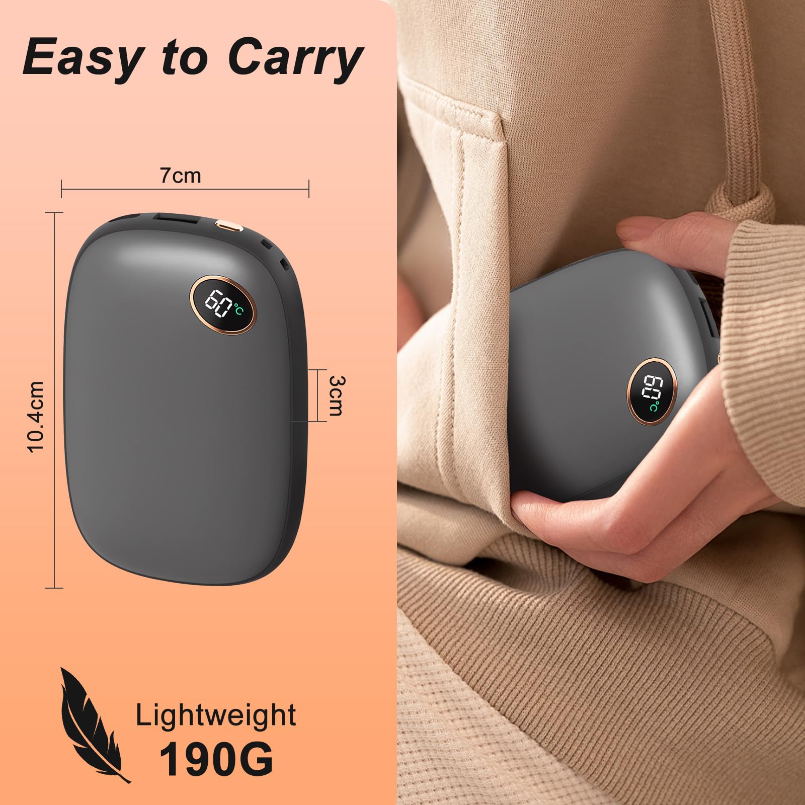Avec 2 packs de 5000 mAh, vous bénéficiez d'une double commodité : 2 chauffe-mains, 2 batteries externes et 2 lampes de poche, partageant la chaleur avec les autres - un pour chaque personne, réchauffant les mains et les cœurs Il est sûr et durable, s'adapte à votre paume. Conçue pour s'adapter à la paume de votre main, la sensation du silicone est plus confortable. a une température modérée et est efficace pour prévenir les brûlures et vous pouvez l'utiliser en toute confiance. Il dispose d'un port de chargement USB et d'un câble de données. [Léger et portable] : de petite taille et léger, il peut être facilement mis dans une poche ou un sac à dos sans prendre de place. Alimentation de secours pour les équipements. Il intègre un chauffe-mains et une alimentation mobile. Affichage LED Dispose d'un écran LED qui peut être réglé à 45°C ou 60°C. Il peut vous réchauffer pendant le froid de l'hiver tout en fournissant également une alimentation de secours pour les appareils électroniques. Batterie de grande capacité Le Chauffe Main Rechargeable est équipé d’une batterie au lithium de 5200 mAh. Jonwall Chauffe Mains Rechargeable 2 Pièce, Chauffe Main Reutilisable [Matériau de sécurité] : fabriqué à partir de matériaux ABS et en alliage d'aluminium de haute qualité, il présente les caractéristiques de résistance aux températures élevées et d'anti-brûlure, et a la fonction de protection contre la surchauffe et la surchauffe. Il dispose d'un port de chargement USB et d'un câble de données qui intègre un chauffe-mains et une alimentation mobile. [Banque d'alimentation de grande capacité] : Chauffe Main Rechargeable est équipé d'une batterie au lithium de grande capacité de 5 200 mAh. Il présente les caractéristiques d'un chauffage rapide et d'un chauffage double face. La conception visuelle peut afficher clairement la température actuelle. Chauffe Main Rechargeable est doté d'une fonction intelligente intégrée. Cadeau Hiver Camping , Chaufferette Main Rechargeable électriques Chauffe Main Rechargeable [Affichage LED] : Chauffe Main Rechargeable dispose d'un affichage LED qui peut être réglé à 45 ℃ ou 60 ℃. protection contre les éclats, sûre et durable, et la forme est ergonomique.