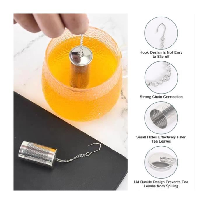 Infuseur à Thé - Tube en Verre - - Haute manufacture de thés Pratique d'entretien : Conçu pour une utilisation quotidienne, ce filtre à thé sèche rapidement, se rince facilement et offre un format compact pour un rangement optimal dans votre cuisine. Filtre A Thé Lot De 2 Infuseurs à Thé En Acier Inoxydable 5cm, Passoire à Thé Avec Infuseur Thé Réutilisable Le filtre à thé réutilisable est conçu avec une maille fine pour ne laisser aucun résidu dans votre boisson tout en étant anti-brûlure pour une manipulation sécurisée. Supprime définitivement les phénomènes de glissement et flottement pour des performances stables, simplifiant le filtrage du thé par une manipulation unihandiale aisée. Filtration performante : Saveurs délicates sublimées par une interaction hydrique accrue, une d'expansion suffisante pour les feuilles et une multicouche complète une efficacité de filtration constante. LAN Porte-Filtre Pour Machine À Café Porte-Filtre À Café En Acier... 4 Pcs Insert D'infuseur Pour Théière Passoires À Au Lait Filtre En raison de la différence de mesure manuelle, veuillez permettre une différence de taille de 1 à 3 cm. Longévité garantie : Conçu en acier inoxydable sélectionné, cet infuseur à thé prévient la déformation et offre une résistante à l'usure pour des performances durables. Parfait pour la maison, la chambre d'étudiant, le travail, les fêtes ou même en voiture, cet outil polyvalent simplifie la préparation du thé où que vous soyez.