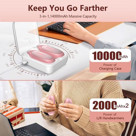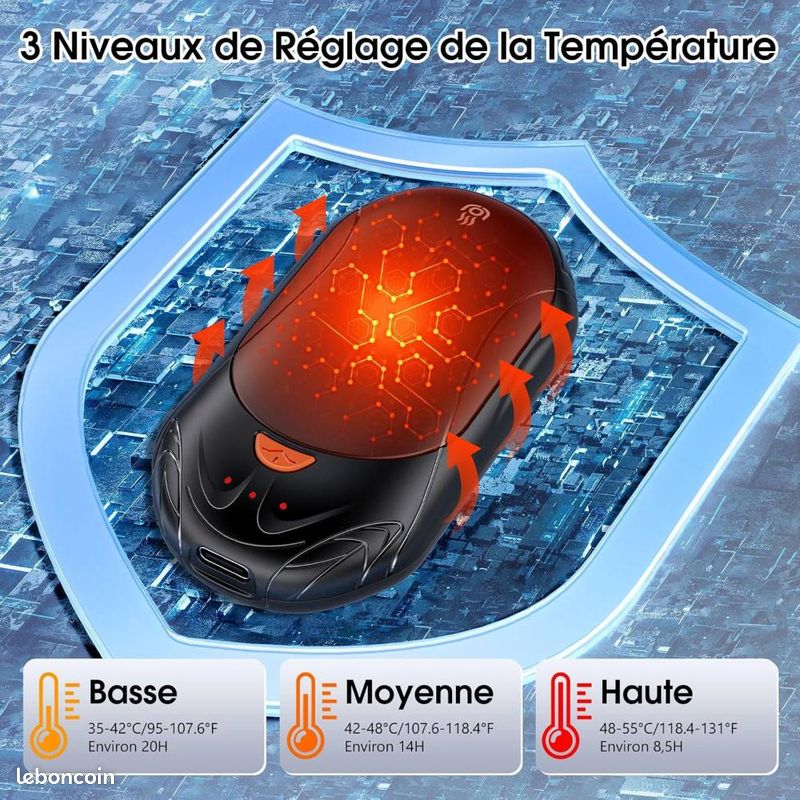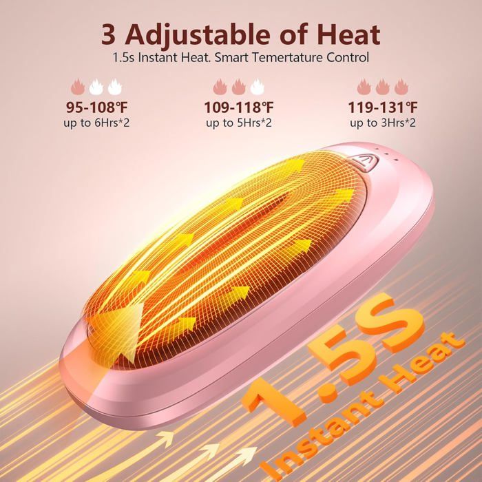 Le chauffe-mains USB réutilisable est fabriqué en matériau ABS résistant à la chaleur pour éviter la surcharge, la surchauffe et les courts-circuits. Chauffe-mains magnétique rechargeable : lot de 2 chauffe-mains rechargeables équipés de quatre aimants puissants, vous pouvez connecter rapidement et facilement deux chauffe-mains ensemble Dimensions : 13 cm x 10 cm x 2,5 cm Poids : 212 g Couleur : noir Matière : ABS Contenu de la livraison : lot de 2 chauffe-mains rechargeables. La double protection de sécurité assure un facteur de sécurité plus élevé pour le chauffe-mains Chaleur agréable et instantanée : ce chauffe-mains électrique dispose d'un système de contrôle intelligent de la température qui empêche les brûlures et chauffe les deux côtés en seulement 5 secondes. [Immédiatement et durable] Chauffe-mains électrique chauffe en 5 secondes avec trois niveaux de température réglables jusqu'à 52 °C/126 °F La batterie au lithium de 6000 mAh est équipée d'un port de charge USB-C pour une longue durée de vie de la batterie. Chauffe-poche avec câbles USB résistants aux chocs et aux chutes, avec Capacité et longue durée de vie de la batterie, il est adapté pour de nombreuses Utilisations telles que les voyages, la randonnée, le camping, le ski, la pêche., et chauffage., 4., Un cadeau parfait pour votre famille : ce chauffe-mains est Un excellent petit cadeau pour les enfants, la famille ou les amis. Le chauffe-mains dispose de trois niveaux de température réglables : 40 °C (104 °F), 50 °C (122 °F) et 60 °C (140 °F). Grande capacité : chauffage électrique portable magnétique - Ce chauffe-mains électrique 2 en 1 est équipé d'une batterie au lithium de 6000 mAh de grande capacité et stable de 5 V/1 A. ou un arrêt en cas de températures trop élevées. Chauffe-mains magnétique rechargeable : lot de 2 chauffe-mains rechargeables équipés de quatre aimants puissants, vous pouvez connecter rapidement et facilement deux chauffe-mains ensemble. Chaufferette Main Chauffe-Mains Rechargeable,6000 MAh Chaufferette Pour Main Magnétique 2 Chauffe Mains Chauffe-mains électrique 6000mAh Chauffe Main Rechargeable 2 Pack, 6000mAh Chaufferette Main Reutilisable Avec 3 Modes Chauffage Item 12863573 Chauffe-mains Pour Poche Gants Que ce soit lors du shopping ou de la promenade – il vous garde au chaud et vous garde au chaud., dans la poche.