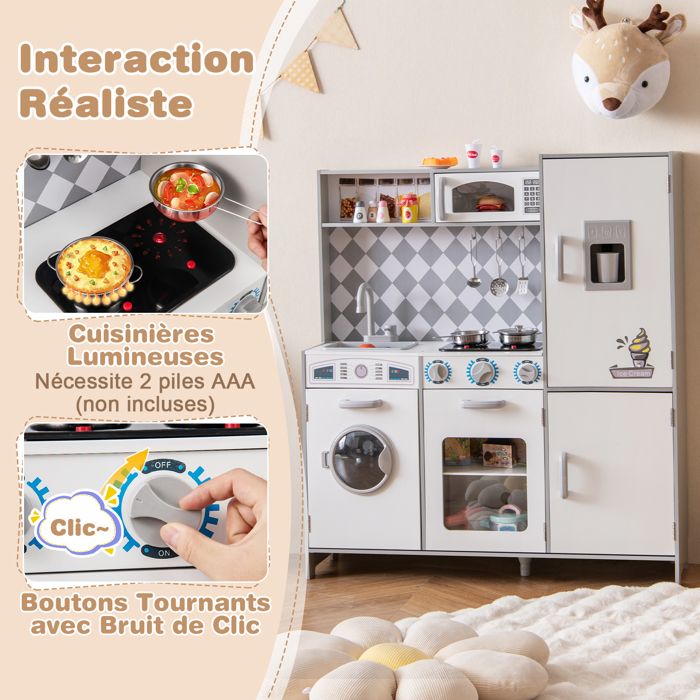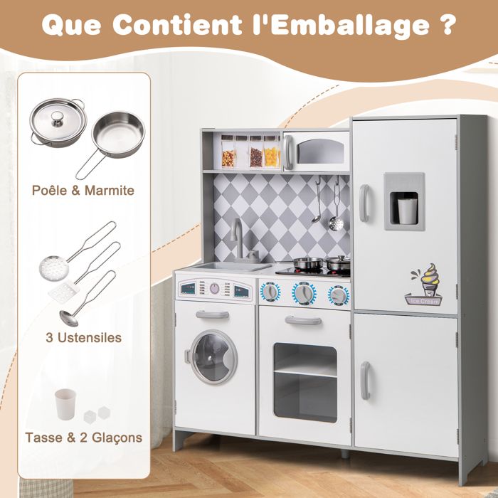 Cuisine Enfant Jouet D'imitation Lumières Et Sons Réalistes Cuisine D'imitation Avec Lumières Sons MATÉRIAUX SÛRS AVEC RANGEMENT : Construite avec des matériaux solides et une base robuste pour la sécurité des plus jeunes, cette cuisinière pour enfant est parfaite pour un usage quotidien. Hape Panier Légumes Jouet en Feutrine - Jeu dImitation Enfant 18 Mo... NOMBREUSES POSSIBILITÉS DE RANGEMENT : Ce jeu de cuisine pour enfants propose de nombreuses options de rangement incluant des armoires, tiroirs, étagères et boîtes en tissu extractibles, encourageant les enfants à maintenir leur espace de jeu propre et organisé Emballé dans une boîte-cadeau, constituant un excellent présent Conforme aux normes de sécurité EU EN-71., CADEAU POUR ENFANTS : Avec son design attrayant et ses fonctions réalistes, cet ensemble de jeu de cuisine pour enfants est un cadeau idéal. COSTWAY Cuisine Enfants avec 48 Accessoires & 8 Modes de Musiques, Jeu de Cuisine avec Vapeur & Lumières & Sons Réalistes, Espace de Stockage, Jouet d'Imitation pour Enfants de 3 Ans+ (Gris ENSEMBLE DE CUISINE ÉDUCATIF POUR ENFANTS : Cet ensemble de jeu de cuisine pour enfants encourage vos enfants à améliorer leur coordination œil-main, à manier les ustensiles en toute sécurité et à développer leurs aptitudes sociales et créatives, tout en s'amusant comme les adultes. Package includes: 1 x Cuisine Pour Enfants 104 x Accessoires 1 x Manuel Sa conception ouverte permet à plusieurs enfants de jouer ensemble, améliorant les compétences sociales et repoussant l'ennui. L'ensemble de cuisine pour bébé en matériaux PP, PE et ABS Le robinet à pression libère de l'eau pour plus de réalisme Un robinet fonctionnel renforce cette impression, enrichissant l'expérience ludique de vos enfants. Conçu pour les enfants de 3 à 6 ans , Montage nécessaire Le set de cuisine AIYAPLAY pour jeu de simulation, avec 104 accessoires, lumières, sons, vaporisateur et robinet interactif, stimule la créativité et la coordination main-œil.