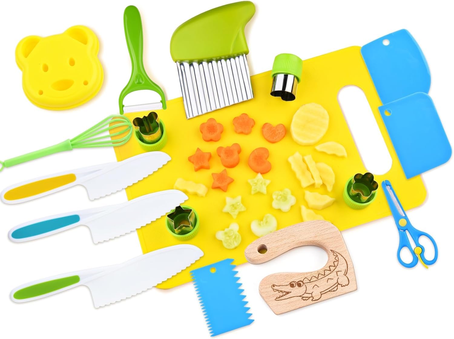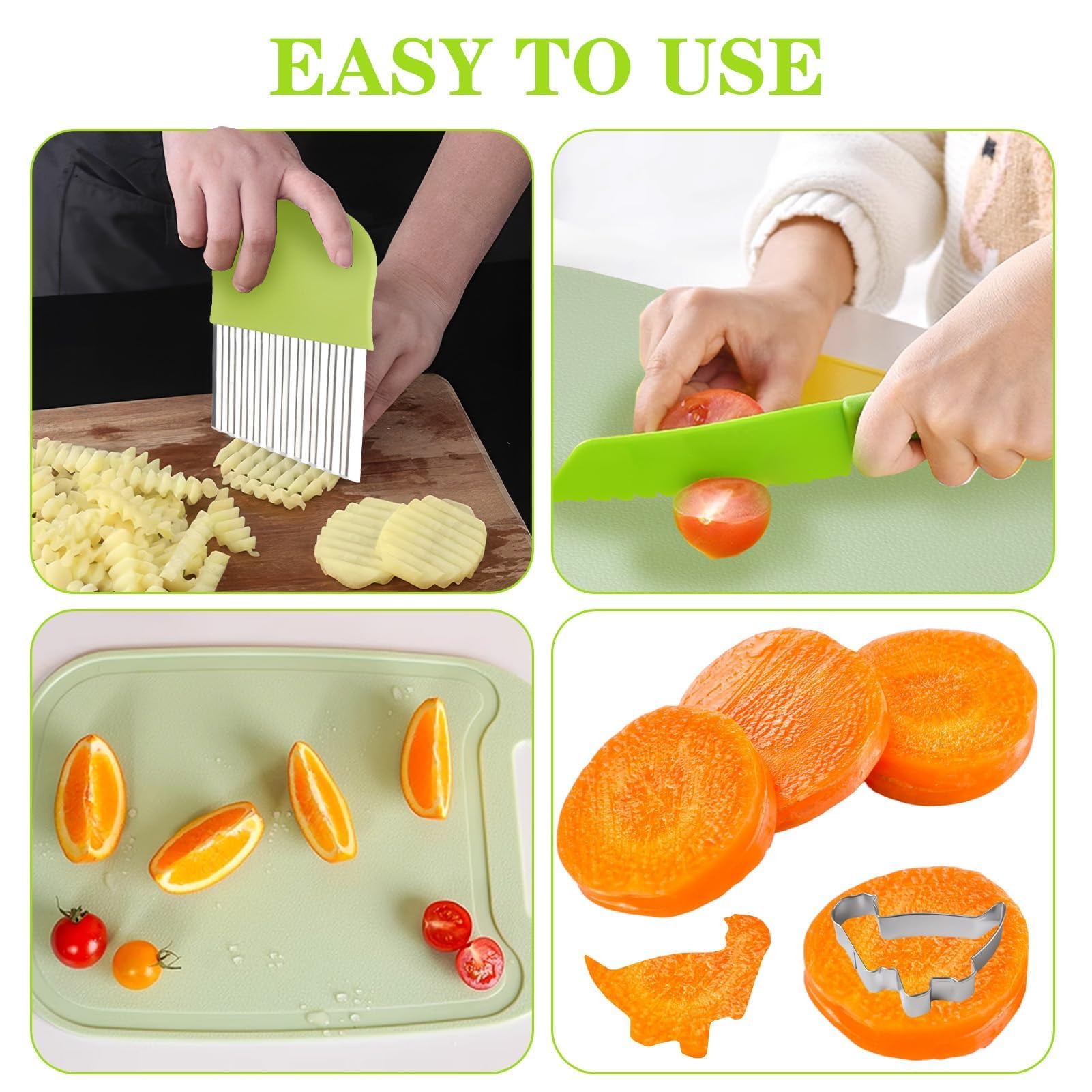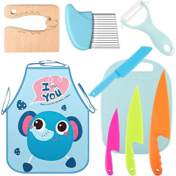 Polyvalence: cet ensemble de couteaux pour enfants vous permet de couper facilement une variété de fruits et légumes. Crocodile Montessori Couteau enfant en bois - Couteau en bois enfant - Couteau de chef Ensemble de couteaux pour enfants de 30 pièces: Vous recevrez 30 pièces de vaisselle pour enfants, composées de 2 planches à découper, 1 modèle à toasts ours, 1 couteau à vagues, 4 couteaux pour enfants, 1 èplucheur en Y, 3 emporte-pièces à gâteau, 4 modèles, 1 ciseaux de cuisine, 1 petit balai et pelle à poussière ensemble, 10 fourchettes de fruits de dessins animés, 1 couteau à fruits. Équipé de moules DIY et de formes d'ours, vous pouvez non seulement préparer de délicieux biscuits, mais aussi créer de jolies formes de fruits. Cet ensemble de couteaux est parfait pour les garçons et les filles âgés de 3, 4, 5, 6, 7 et 8 ans, leur offrant du plaisir tout en jouant et en apprenant. Il peut développer les compétences pratiques des enfants et constitue le meilleur choix de cadeau pour les enfants. Conception sûre: Ces couteaux pour enfants sont fabriqués en polypropylène de qualité alimentaire de haute qualité, ne contiennent aucun ingrédient nocif et sont sûrs à utiliser. Kibbidea 4 Pièces Kit Couteau de Cuisine pour Enfants, Bords Ronds, Acier Inoxydable, à partir En même temps, il peut être utilisé dans les cours de cuisine pour stimuler l'intérêt des enfants pour l'apprentissage des compétences culinaires et entraîner la coordination œil-main. Cet ensemble de couteaux pour enfants peut répondre à vos différents besoins culinaires et ajouter du plaisir aux jeux de cuisine pour enfants. Développement des compétences des enfants: Cet ensemble de cuisine pour enfants est une bonne aide pour les enfants car il leur permet de participer au processus de cuisson avec leurs parents, améliorant ainsi l'interaction parent-enfant. Couteaux cuisine pour enfants/EASYCOUTEAUX™ – Nour Ustensiles Cuisine Enfant 30 Pièces AOMiGT Couteau Enfant, Couteau De Cuisine Kids, 4pcs Couteaux De Kit Cuisine Enfant Le couteau contient 4 couteaux dentelés, qui ont tous un design dentelé et protègent efficacement les doigts des couteaux métalliques tranchants.