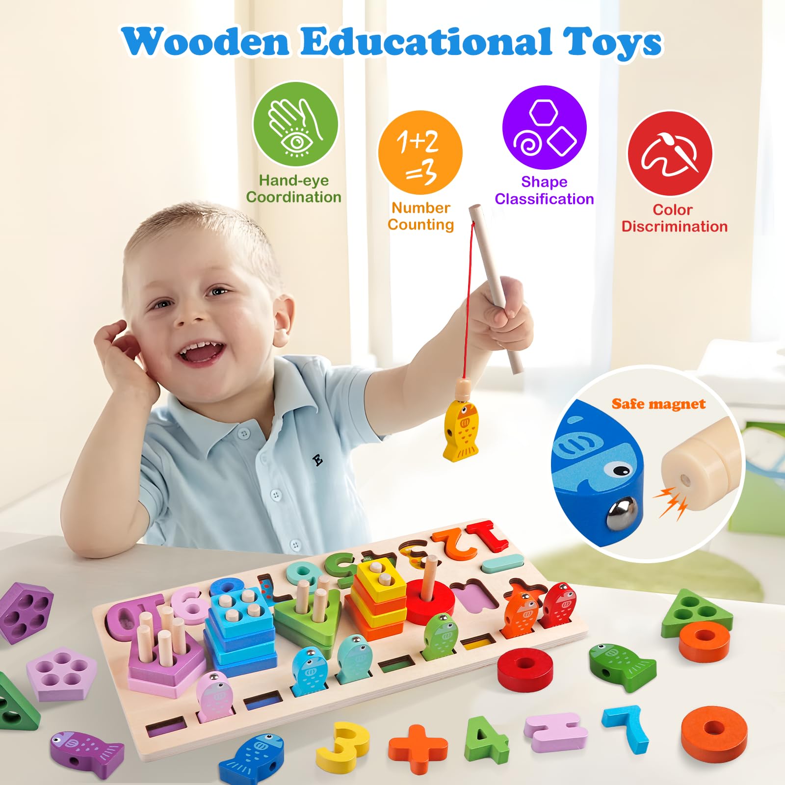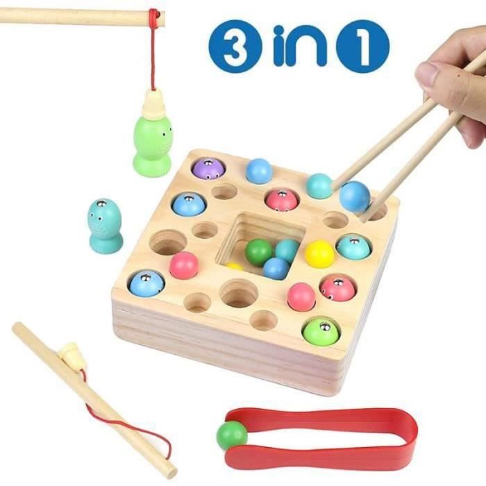 Ce jouet est idéal pour les interactions parents-enfants et constitue un cadeau parfait pour des occasions spéciales comme anniversaires ou fêtes. Il combine pêche, puzzles, chiffres et formes en un seul jouet. Le jeu comprend une planche de puzzle en bois, 10 poissons en bois magnétiques, 10 blocs numériques (1 à 10), 10 blocs de formes, 11 pièces de puzzle d’animaux en bois et une canne à pêche en bois. TEMPS EN FAMILLE: Ce jouet permet aux parents de partager des moments précieux avec leurs enfants. Attire l’attention des enfants et les accompagne sur le long terme. Jeu éducatif Pêche Puzzle Chiffres Formes KUKUTrue® 2 3 4 5, Jeux Enfants 2 Ans, Puzzle 2 Ans Jouet Montessori Avec pêche, puzzles et reconnaissance des nombres et formes, il stimule capacités pratiques et cognitives, favorise découverte autonome et raisonnement logique. APPRENTISSAGE ET CROISSANCE: La pêche et les puzzles améliorent coordination œil-main et motricité fine. Le jouet est fabriqué en bois de haute qualité, soigneusement poncé pour garantir une surface lisse, sans éclats, assurant la sécurité des enfants. Chaque pièce est soigneusement conçue, avec couleurs vives et grande durabilité. Une sélection de jouets et jeux Montessori soigneusement choisie pour l'apprentissage et le jeu libre des enfants Notre jolie boutique Jouet Montessori a rassemblé une sélection des meilleurs jeux et jouets d'apprentissage, spécialement conçus pour renforcer la motricité fine et encourager le jeu libre chez les tout-petits Description du produit Ce jouet Montessori quatre-en-un de pêche et puzzle a été spécialement conçu pour les enfants de 2 3 4 5 ans. En interagissant avec les poissons, les pièces de puzzle, les chiffres et les formes, les enfants améliorent leur observation et leur mémoire. MATÉRIAU DE HAUTE QUALITÉ: Fabriqué en bois de qualité, lisse et sans éclats. Il aide les enfants à développer leur motricité fine et leur coordination œil-main. Console Mon Premier Dokéo pour Jeux Educatif Enfant 2 Ans Jouet Enfant 3 4 5 Ans, Labyrinthe Magnetique, Jouet Fille 3 Ans Garcon JOUET MONTESSORI: Ce jouet Montessori est conçu pour les enfants de 2 3 4 5 ans.