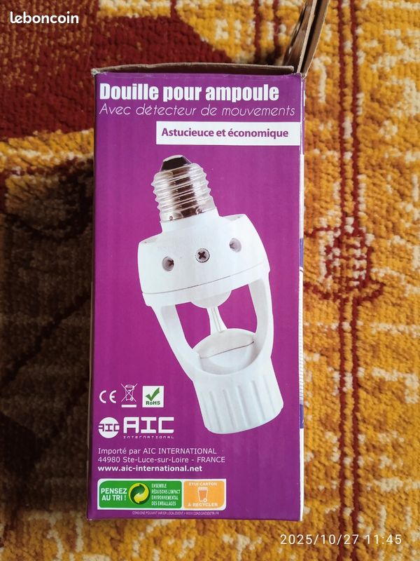 Les mesures étant prises à la main, les tailles indiquées peuvent varier de 1 à 2 cm. Douille E27 avec détecteur de mouvement de 360° - Bricolage Notre douille de lampe à visser avec détecteur de mouvement permet un contrôle intelligent en allumant la lumière lorsque quelqu'un entre et en éteignant quand quelqu'un sort. Détection de mouvement efficace : avec une induction sensible et une technologie avancée de détection de mouvement d'objet, cette prise lumineuse à détecteur de mouvement garantit une détection rapide et précise et offre une solution d'automatisation intelligente Large application : la compatibilité élevée garantit l'adaptation à la plupart des ampoules LED et des ampoules à incandescence traditionnelles, la vis E27 étant une interface généralement reconnue dans l'éclairage Contrôle d'économie d'énergie : grâce à la capacité de détecter les activités humaines et d'activer la lumière en conséquence, la prise lumineuse à détecteur de mouvement garantit d'éviter le gaspillage d'énergie inutile, ce qui en fait une solution écologique et économe en énergie La conception générale de vis permet une installation facile et rapide et fournit des résultats efficaces et stables. Fafeicy Douille de Lumière à Capteur de Mouvement avec Marche/arrêt Automatique, Adaptateur D'ampoule à Vis E27 à Mouvement PIR Réglable pour Garage Puissance de charge : 100 W. Évitez le gaspillage d'énergie inutile avec cette douille E27 à interface générale. Matériau de la coque : ABS Température de résistance à la chaleur : 50 °C (℃). Capteur Litwod 2 en 1 lampe à veilleuse LED activée par mouvement... Douille Avec Détecteur De Mouvement Douille De Capteur E27, Délai De 10 à 300 S, Distance De Détection De 6 M, Support D'ampoule Activé Par Le Mouvement IR, Multifonction, Contrôle Automatique, Capteur De Lumière éclairage Automatique Extérieur Spécifications: Tension : 85-265 V (V) Courant : 110 mA (A) (A).