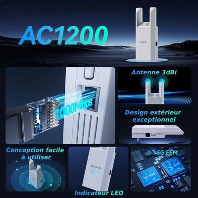 TAP200 : Répéteur WiFi double bande 2.4GHz/5GHz 【4 Modes Polyvalents pour Tous Besoins】Répéteur WiFi, mode Point d’Accès (AP), routeur ou pont : cet amplificateur WiFi s’adapte à vos scénarios réseau. Répéteur WiFi, Amplificateur WiFi 1200Mbps Double Bande 5GHz & 2.4GHz Couvre jusqu'à 1200m² Repetiteur WiFi Puissant sans Fil Protection WPS avec 6 Antennes, Compatible avec Toutes Les Box Internet en destockage et Sélection automatique de la bande optimale pour des performances stables et un répétiteur WiFi puissant sans fil ultra-rapide. 【Connectivité Intelligente pour Maison Connectée】Supporte +30 appareils simultanés (smartphones, caméras IP, enceintes Alexa) grâce à la norme IEEE 802., 11ac/a/b/g/n. Ce répéteur WiFi extérieur résiste aux interférences et sécurise vos données contre les accès non autorisés, même en utilisation prolongée. Répéteur WiFi, 1200Mbps Amplificateur WiFi sans Fil Puissant,Dual Band... Répéteur WiFi Puissant Amplificateur WiFi Puissant 1200Mbps WiFi Range Extender Double Bande 5ghz 2 4ghz Wifi Booster Avec Port Ethernet Facile A Installer Compatible Avec Tous Les Routeurs Fiche Sa portée étendue et sa pénétration accrue garantissent une connexion fiable même à travers les murs épais, parfait pour les grands espaces. Compatible avec tout routeur standard, son port Ethernet relie aussi les appareils filaires (TV, consoles). Idéal pour le streaming HD et les jeux en ligne sans interruption.