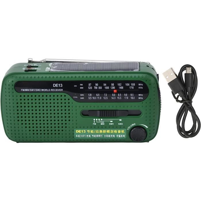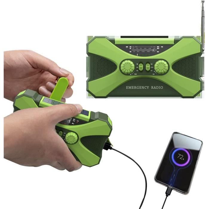 Les Deux Haut-Parleurs Offrent Une Meilleure Qualité Sonore : La Radio Portable MultifréQuence Adopte Une Conception à Double Haut-Parleur Haut/Bas Pour Une Meilleure Qualité Sonore. Trois modes d'éclairage pour la radio Radio D'urgence QAUYYW Radio D'urgence U00e0 Manivelle 20 000 MAh/74 000 MWh Avec Lampe De Poche LED, SW/AM/FM NOAA Radio D'alerte Mu00e9tu00e9o Portable, Radio U00e0 U00e9nergie Solaire Avec Chargeur De Tu00e9lu00e9phone, Charge Il S'Agit D'Une Radio D'Urgence Portable Pour Les Pannes De Courant à Domicile, Ou D'Un Outil De Survie Autonome Pratique Que Vous Pouvez Utiliser Pour Tous Vos Voyages, Tels Que Le Camping, La RandonnéE, Etc. Son StéRéO Puissant Et Basses Profondes Pour Une Meilleure ExpéRience Lorsque Vous éCoutez Des Programmes Radio Ou De La Musique. Il Ne S’Agit Pas Seulement D’Une Radio D’Urgence à Manivelle, Mais éGalement D’Une Banque D’Alimentation D’Urgence Et D’Un Chargeur De TéLéPhone Portable. Il Est éGalement Livré Avec Une Prise Casque 3,5 Mm, Vous Permettant De Profiter De Votre Musique Ou De Vos Programmes Radio PréFéRéS Sans Interruption. Trousse De Premiers Secours D'Urgence : La Radio Fm/Am/Alerte MéTéO Est SpéCialement ConçUe Pour Les Besoins D'Urgence. Fdit radio à manivelle d'urgence RD639 Radio solaire chargeur de Banque D'Alimentation D'Urgence 10 000 Mah : La Radio à Manivelle AméLioréE Dispose D'Une Batterie Rechargeable IntéGréE De Grande Capacité De 10 000 Mah, Qui Peut Charger Plus De 2 TéLéPhones Portables. Description du produit Fonctionnalités portables de la radio La radio a une longue durée de vie et est équipée de fonctions d'urgence
