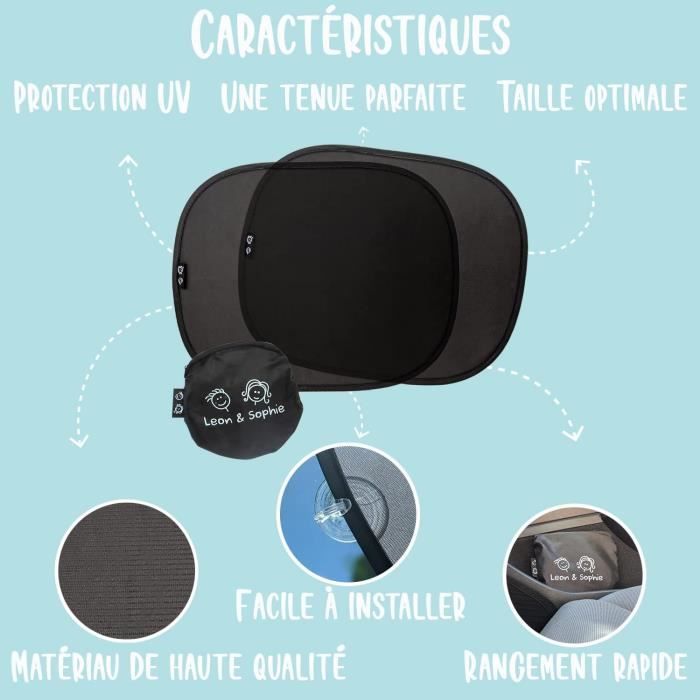 2 Pièces Pare Soleil Voiture Bébé-Enfant-Animaux, Teinte Optimale... Cette double fixation garantit la stabilité du pare soleil voiture sur n'importe quelle route, que ce soit pour une utilisation quotidienne ou lors de voyages en famille avec le pare soleil voiture bébé. 2 Pièces Pare Soleil Voiture Bébé-Enfant-Animaux, Teinte Optimale Dimensions 51x30 Cm Universel Pare-Soleil Voiture Bébé Avec Protection UV Certifiée Universel 48 X 30 Pare Soleil Spécialement conçu pour protéger les bébés lors des trajets, ce pare soleil voiture bébé est l'allié idéal pour les familles qui circulent régulièrement. 📦【STOCKAGE CONCOMPACT】 Le pare soleil voiture se plie pour réduire sa taille de 80% (de 51x30cm à 15x10x3cm) et vient avec un sac imperméable pour stocker 2 parasols et les ventouses. Sa taille compacte permet de le ranger facilement dans le compartiment de gants ou dans les poches des portes, making it the perfect companion for both daily use and trips with the pare soleil voiture bébé. 🔧 【DOUBLE SYSTÈME D'INSTALLATION】Le pare soleil propose un système combiné d'adhésion statique sans résidus (idéal pour les vitres lisses) et 8 ventouses à haute aspiration (4 de rechange). - Appliquer le parasol directement et presser pour fixer (sans résidus)., 2., Ventouses Hautes Aspiration - Utiliser les 8 ventouses (4 de rechange). ⚠️ CONSEILS - Ne pas utiliser sur des vitres trop incurvées. 🌞 【PROTECTION SOLAIRE COMPLÈTE POUR LA FAMILLE】Notre pare soleil innovant combine une maille de 80 g/m² et une couche anti-UV en gomme noire, bloquant 98% des rayons UV. - En cas de déformation des ventouses, plonger 30 s dans l'eau bouillante, refroidir et réutiliser. 📝 【CONSEIL PRATIQUE】En cas de déformation des ventouses lors du transport, plongez-les 30 secondes dans de l'eau bouillante, serrez-les immédiatement et laissez-les refroidir. Il offre une flexibilité de montage sans compromettre l'efficacité, que ce soit pour une voiture de ville ou une berline familiale. - Conserver dans le sac imperméable fourni, éviter les températures extrêmes.