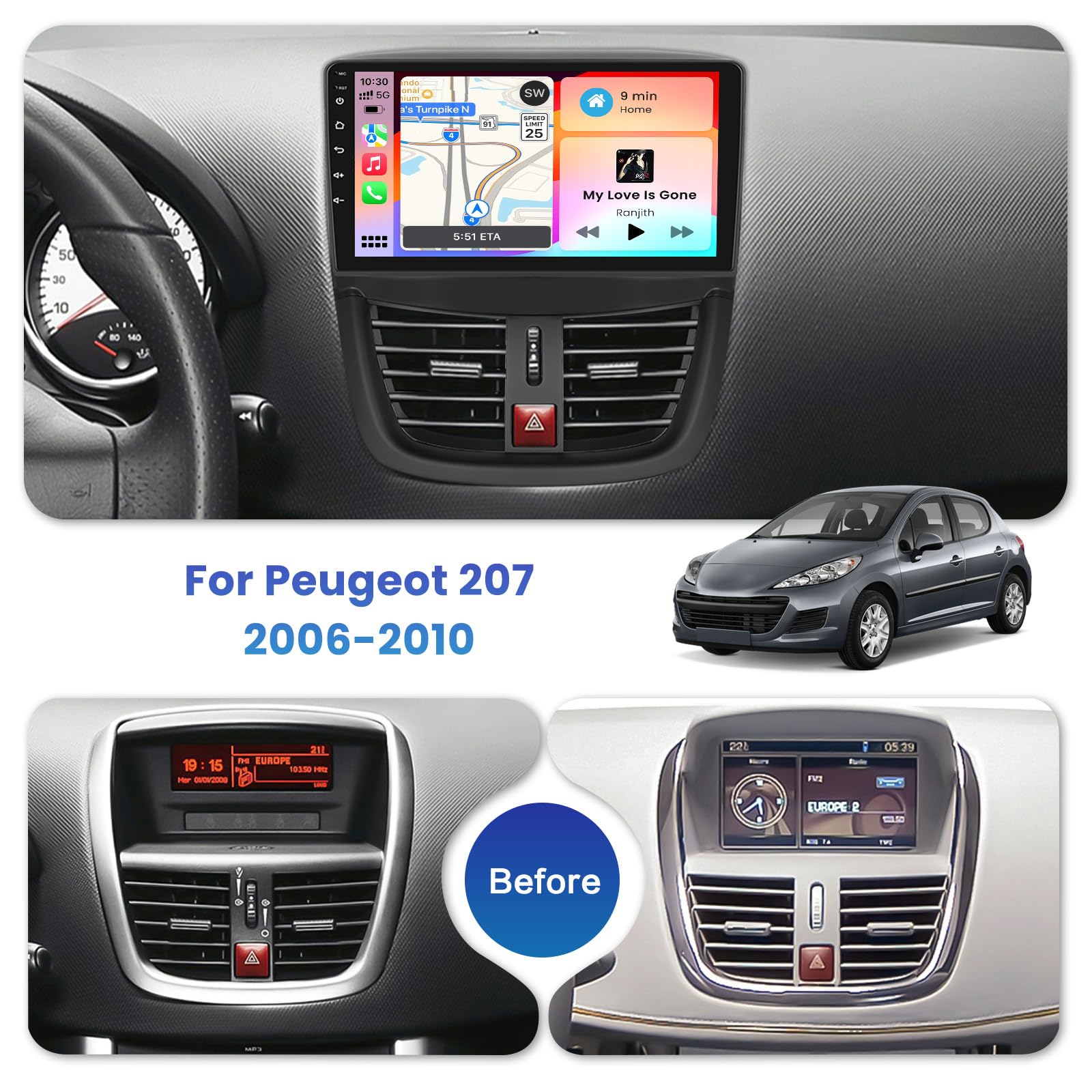 CarPlay sans fil et Android Auto : cette radio Android prend en charge l'accès sans fil/filaire CarPlay et sans fil/filaire Android Auto aux fonctionnalités du téléphone telles que la musique, la navigation, les appels, les notifications, etc. Navigation GPS et cartes hors ligne : L'autoradio amélioré intègre un module GPS compatible avec des applications de navigation comme Waze. Autoradio écran Tactile Capacitif Carplay Android Auto Sans Fil Autoradio Android 15 Peugeot 207 2009-2013 - Écran 9 Pouces, Carplay Sans Fil | 2+64GB, Caméra Recul Gps Bluetooth Wifi Caméra Recul Radio GPS Intégré Caméra Recul 1 Caméra de recul 2 SWC 1 Radio FM/RDS 2 Bluetooth 3 Écran 9 pouces 4 28 UI Caméra de recul : lorsque l'autoradio CarPlay est connecté à une caméra de recul, la vue arrière s'affiche automatiquement lorsque le véhicule est en marche arrière, améliorant ainsi la sécurité du stationnement. Autoradio Android 2+64 Go : spécialement conçu pour la Mazda 2 (2007, 2008, 2009, 2010, 2011, 2012, 2013, 2014), écran tactile capacitif HD 9 pouces pour la visualisation vidéo et la navigation. 1 Carplay&Android Auto 2 GPS 3 Mirror Link 4 WiFi 2+64G Inefala Wireless Carplay Autoradio Android für Renault Dacia