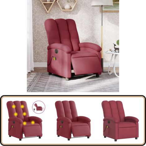 Entrée du moteur électrique : c., c. Matériau : similicuir (60 % polyuréthane, 30 % polyester, 10 % coton), contreplaqué, métal Options : massage sans chauffage Le similicuir est un matériau très résistant. De plus, la télécommande incluse vous permet de choisir différents programmes de massage. VidaXL Fauteuil De Massage Rouge Bordeaux Similicuir - Fauteuil - Rue Du Commerce 【Fonction d'inclinaison électrique :】 ce fauteuil inclinable est équipé d'un moteur électrique qui permet de régler automatiquement le repose-pied et le dossier dans n'importe quelle position, selon votre confort, en appuyant simplement sur le bouton situé sur le côté du fauteuil. La fonction de massage est alimentée par le connecteur USB qui nécessite une source d'alimentation USB certifiée de 5 V (non fournie). Tension d'entrée : 5V c., c. 【Fonction de vibration :】 les 6 points de massage vous permettent de faire l'expérience d'un massage mieux ciblé. 【Poche latérale pratique :】 ce fauteuil est doté d'une poche latérale pour ranger votre télécommande ou garder vos objets essentiels à portée de main. Description du produit Choisissez le style qui vous convient!, Couleur : rouge bordeaux Avec un moteur électrique pour le réglage automatique du dossier et du repose-pied Cette fonction permet une inclinaison maximale de 135 degrés. Type de massage : massage par vibrations par 6 points VidaXL Fauteuil De Relaxation, Massage, Inclinable électrique Similicuir Rouge - Fauteuil De Massage Electrique Chaise De Relaxation Avec Dossier Et Repose Pied Reglables Siege De Salon Moderne Rouge Similicuir Il est résistant aux taches, ce qui le rend facile à nettoyer avec un chiffon humide. Capacité de charge maximale : 110 kg