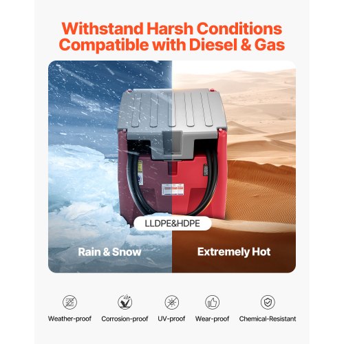 Nous adoptons une jauge de carburant mécanique visant à surveiller la capacité du diesel à temps, vous rappelant de faire le plein à temps. Ravitaillement efficace de 48 gallons/182 L : Débit : 10,6 GPM/40 L/min. Pompe Transfert Carburant VEVOR Réservoir Diesel Essence Portable, 182 L, Cuve De Ravitaillement Carburant, Pompe De Transfert 12 V, 40 L/min, Tuyau 4 M, Buse Ravitaillement Auto, Pour Véhicules Agriculture Industrie, Rouge Parfait pour les camions, les tracteurs, les navires, les camping-cars et tous vos besoins en extérieur ou en construction. Buse de ravitaillement automatique : Vous en avez assez de trop remplir votre réservoir de diesel ? Cette buse de carburant s'éteint automatiquement lorsque le réservoir est plein, ce qui évite efficacement le gaspillage et les déversements d'huile. Que vous ayez besoin de diesel ou d'essence, la conception polyvalente de ce réservoir vous couvre, vous offrant plus d'options et un meilleur contrôle sur les coûts de carburant. De plus, l'adaptateur rotatif a été amélioré pour aider le tuyau à se dénouer. Transportez facilement du diesel/de l'essence : Avec des côtés rainurés et des poches pour chariot élévateur, ce réservoir de carburant portable reste bien en place sur votre véhicule. Réservoir Diesel Portable, 182 L, Cuve de La pompe de transfert 12 V fournit une puissance élevée pour acheminer le carburant du réservoir de carburant diesel vers vos véhicules avec une grande efficacité. Notre réservoir diesel portable est fabriqué en polyéthylène de haute qualité, capable de gérer les conditions météorologiques changeantes et résiste aux rayons UV. Le couvercle supérieur est verrouillable par une serrure en cuivre qui protège contre le vol et assure la sécurité de fonctionnement.