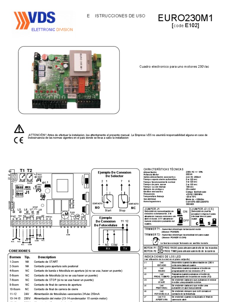 Plaque de contrôle plaque VDS EURO 230 M1., Tableau de contrôle pour moteurs coulissants, basculants contrepoids, barrières entre autres applications., Alimenté à 230 V CA. Placa de Control VDS EURO 230 M1 ECO sin caja Sortie d'alimentation accessoires : 24 V CA 250 mA. Température de fonctionnement : -20 à 70 °C. Chez FGMATIC, nous avons un support technique du lundi au vendredi pendant les heures de bureau pour résoudre tout doute., Tlfns : 912775712 - 677592704 Motor Puerta Corredera Cuadro De Control Euro 230 Placa De Control Placa VDS EURO 230 M1 Cuadro De Control Para Motores De Corredera, Basculantes Contrapesadas, Barreras Entre Otras Aplicaciones. Alimentado A 230Vac Temps de fermeture automatique : 5 à 120 secondes. Alimentation : 220 V AC +/- 10 %, puissance moteur : 550 W, sortie alimentation accessoires 24 V 250 mA. Deux ans de garantie. Temps de fonctionnement normal : 3 à 120 secondes. Tableau de commande central pour 2 moteurs OLTRE 1824 OLTRE1824 NICE MC824L Temps de lumière de courtoisie : 180 sec., Fréquence : 433,92 / 868 MHz. Cuadro de maniobra – VDS EURO 230 m1