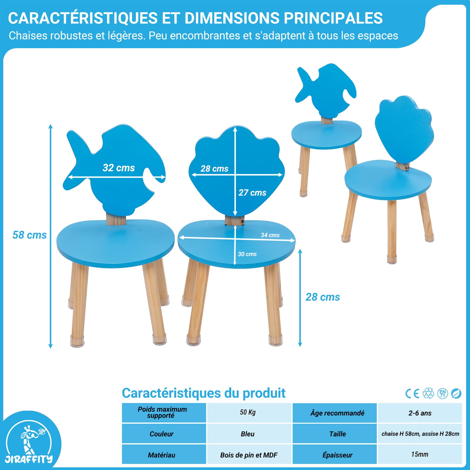 Cette conception assure que les chaises n'endommagent pas les surfaces, tout en offrant une stabilité supplémentaire pendant l'utilisation, protégeant ainsi tant les petits que votre foyer. Chez , nous fabriquons des chaises pour enfants, des tables pour enfants et des bureaux en bois. Tout est fabriqué à la main. Quoi de mieux pour votre enfant que d'avoir son propre bureau ou un set de meubles assortis pour sa chambre d'enfant Fabriquées avec des matériaux robustes, les chaises comprennent des dossiers renforcés en bois pour plus de stabilité. ✅ DESIGN MARIN AMUSANT : Lot de deux chaises pour enfants avec dossiers en forme de poisson et de coquillage, parfaites pour décorer n'importe quelle chambre d'enfant et rendre l'espace plus amusant ✅ PROTECTION DU SOL : Pieds avec embouts en silicone qui évitent les glissements et protègent le sol des rayures Leur hauteur est parfaite pour les enfants de 2 à 6 ans Légères et faciles à déplacer, elles sont le complément idéal pour n'importe quelle chambre d'enfant. Chaise bébé en bois pour enfants adaptée aux garderies et jardins d Ce renforcement offre la stabilité nécessaire pour supporter l'usage quotidien, garantissant la sécurité et le confort des enfants pendant leurs activités. De plus, les pieds sont équipés d'embouts en silicone pour protéger le sol et éviter les bruits gênants. Dossiers renforcés pour plus de stabilité Les dossiers des chaises JIRAFFITY sont fabriqués en bois naturel et renforcés avec des vis, assurant une structure résistante et durable. YUENFONG Ensemble Table et Chaises pour Enfants Table de Blocs de... Chaises Bureau Enfant Sécurisées Lot De 2 Chaises Pour Enfants En Bois Massif Naturel | Maisons Du Monde Chaise En Bois Enfant Sécurité, Résistance et Simplicité : Les Trois Atouts des Chaises JIRAFFITY Bords arrondis pour plus de sécurité Tous les éléments des chaises pour enfants JIRAFFITY disposent de bords arrondis pour éviter les accidents et offrir un environnement sûr et confortable pour les petits.