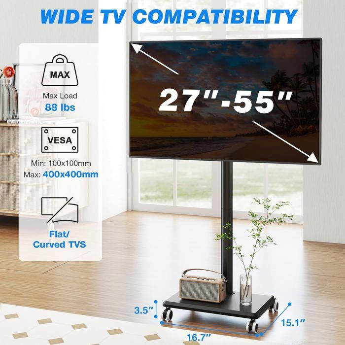Support TV roulettes avec Support Cantilever Chariot TV pour Ecran Télé 27-65 Pouces Plasma LCD 5Rcom Support TV Roulettes Avec Roulettes Cachées, Support TV Roulettes Avec Roulettes Cachees Support Tv Sur Pied Et Reglable En Hauteur Pour Televiseurs De 24 A 55 Pouces Tv Universel Pivotant Charge Maximal 30 Kg Vesa Max 400x400mm Blanc Comparatif des 4 meilleurs meuble tv sur roulettes - Tout pour la maison avec Poret Support sur Pied TV Universel Pivotant