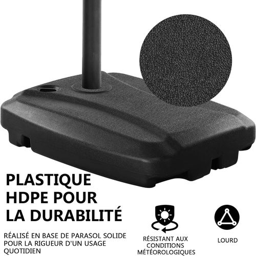 Contenu de la livraison : 1 pied de parasol avec roulettes. Caracteristiques Poids de 23 kg pour un maintien solide du parasol. Poignée sur le tube en acier pour sécuriser le mât. Diamètre de la roue: 4 cm Poids net : 23 kg. Les freins de stationnement intégrés assurent un maintien sûr à l'endroit souhaité, que ce soit dans le jardin, sur la terrasse ou au bord de la piscine. Si vous êtes à la recherche d'un support pour votre parasol, notre pied de parasol est un bon choix. Dimensions totales : 52 x 43,5 cm (D x H) Diamètre approprié du trou de barre : 38 mm/48 mm Longueur de la barre en acier : 26 cm. Le pied de parasol de 23 kg offre au parasol un maintien solide. Pied lourd et stable avec un poids de 23 kg, ce pied de parasol assure un maintien sûr de votre parasol de terrasse. Matériau : résine, acier. Le pied parasol déporté : l'accessoire pratique pour votre jardin Les roues verrouillables facilitent considérablement le déplacement de la base. Design élégant et montage facile : le motif décoratif en rotin sur la surface confère au pied un aspect élégant. Support parasol balcon - Pour balustrades diamètre max. 38mm, vente au La base en acier et résine de haute qualité est assez durable et ne rouille pas facilement. Trou de tige réglable le rend adapté aux parasols de différentes tailles. Matériau de qualité supérieure pour une longue durée de service. 1 manuel d'utilisation (français non garanti). Pied De Parasol à Visser Base à Remplir Pied De Parasol à Remplir FANTASK - Pour Mâts 38/48 Pied Parasol Balcon Terrasse Pivotant En outre, 4 roues de qualité supérieure vous permettent de déplacer ou d'arrêter facilement le pied de parasol. Mobile grâce aux roulettes avec fonction de blocage. Description: Ce porte-parasol en résine avec roues verrouillables est un fabuleux compagnon des parasols de terrasse. Quatre roulettes pivotantes à 360° permettent de déplacer le support sans effort.