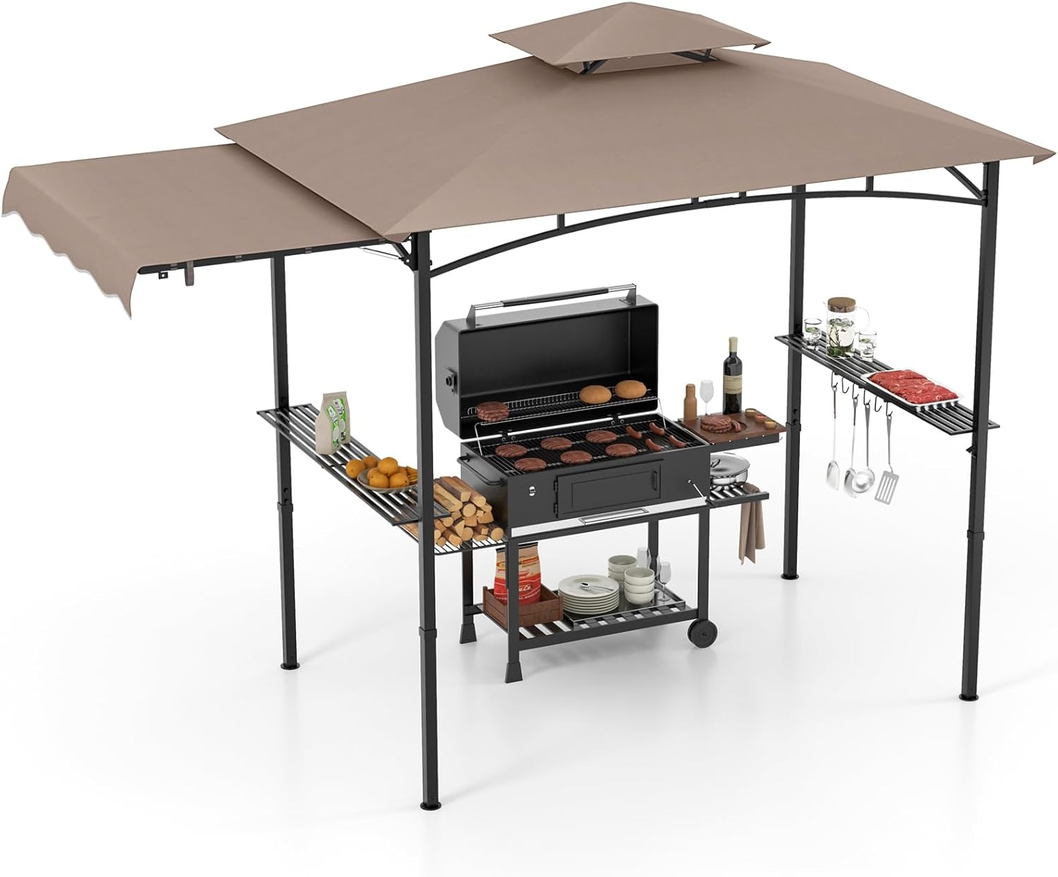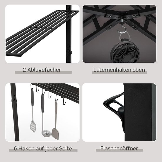 Auvent Latéral Hydraulique étagères Kavolet Avec étagères Latérales - Auvent Pour Barbecue - Résistant Aux Intempéries - Pour Barbecue - Tente De Barbecue - Toit - Anthracite - 210 X 114 X 230 Cm - Acier Tonnelle De Barbecue Dimensions de la tonnelle (L x l x h) : 242 x 153 x 250 cm. Montage facile : le cadre de support de la tonnelle de barbecue est relié à des vis à pouce pratiques qui permettent une installation sans outil et sans effort. Avertissement De Sûreté Tenir hors de portée des enfants. Espace de rangement supplémentaire : la tonnelle d'extérieur dispose de 2 étagères latérales en métal et de crochets de rangement, ce qui permet un accès facile aux couverts, à la vaisselle et aux accessoires de barbecue. En outre, des plaques de sol et des sécurités pour pieux sont disponibles qui augmentent encore la stabilité globale. Construction stable : la tonnelle de barbecue est soutenue par un cadre en métal robuste revêtu par pulvérisation qui garantit une grande résistance et une résistance à la rouille. En outre, elle est ignifuge, ce qui augmente la sécurité. En outre, il dispose d'un auvent en polyester résistant au soleil et aux flammes et d'un cadre en métal inoxydable conçu pour résister à différentes conditions météorologiques et assurer une utilisation à long terme en extérieur. Pavillon De Barbecue 240 X 150 X 257 Cm - Tonnelle De Jardin Impermeable Et Ignifuge Avec Toit Double Etageres Laterales Protection Uv Structure En Acier Ideal Pour Fetes Et Bbq Beige 87981138 Spécifications: Livré avec un auvent latéral, offre une couverture d'ombrage et une protection supplémentaires. Tonnelle barnum style colonial double toit toiles latérales amovibles 2... Pour une utilisation en extérieur uniquement. L'auvent latéral est contrôlé par des barres hydrauliques et offre un maintien stable. En outre, les tubes d'angle supérieurs du cadre peuvent être réglés en 3 positions, de sorte que vous pouvez régler le baldaquin à un état lisse et élégant. 1 manuel d'utilisation (français non garanti). Contenu de la livraison : 1 tonnelle pour barbecue. (Remarque : veuillez ne pas l'utiliser dans des conditions météorologiques extrêmes) HOMASIS Tonnelle de Jardin Pliante Extérieur, Gazebo Barbecue avec Double Toit, 2 Tables, Crochets et Ouvre-Bouteilles, Pergola de Réception Résistant aux Intempéries pour Jardin, Grill (Gris foncé Dimensions de l'auvent : 84 x 135 x 196 cm (L x l x H) Garde au sol : 200 cm Dimensions des tables latérales en métal : 126 x 20 cm (L x l) Poids net : 20 kg. En outre, il s'ouvre et se ferme facilement avec les barres hydrauliques améliorées.