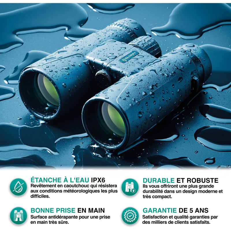 Caractéristiques du produit : Les jumelles épurées, entièrement étanches 8 x 42 offrent une vue de près des sujets éloignés dans toutes les conditions météorologiques. Jumelles Chasse Fretrecy Jumelles 12x42 Pour Adultes Et Enfants Avec Trépied, Vision Nocturne Pour L'observation Des Oiseaux, La Randonnée, Les Voyages Avec Lentille BAK4 FMC (8 In 1 Optique FMC Bak4 Le boîtier binoculaire en polycarbonate résistant aux chocs Eyeskey est blindé en caoutchouc pour une meilleure durabilité et une prise en main sûre. Système optique FMC Pour répondre aux plus hauts standards en termes de clarté d'image et de richesse des détails, nous avons conçu les jumelles avec des optiques entièrement multicouches pour permettre plus de lumière de passer à travers les oculaires, offrant ainsi des images plus lumineuses, plus nettes et plus contrastées. ✔️ PLUS DE BEAUTÉS AVEC LE CHAMP DE VISION DÉCENT - Imaginez que vous parcourez une vaste zone à la recherche d'objets en mouvement rapide comme des cerfs ou des oiseaux qui ne semblent jamais rester immobiles, le large champ de vision les gardera plus à votre portée. Excentrique Perspicace Pointe de flèche les juelles les plus puissantes France Justice cobiner... Culaires avec torsade Œilletons supérieurs, une molette centrale de réglage en douceur et des capuchons d'objectif captifs qui ne se perdent jamais ✔️ IMAGE PLUS LUMINEUSE ET PLUS FORTE AVEC OPTIQUE OPTIMISÉE - Pour répondre aux normes les plus élevées en termes de clarté d'image et de richesse de détails, nous avons conçu ces jumelles avec le prisme de toit Bak-4 et l'optique entièrement multicouche pour permettre plus de lumière à la périphérie du champ. ✔️ CONSTRUCTION ROBUSTE POUR USAGE EXTÉRIEUR LOURD - IMPERMÉABLE ET ANTI-FUMÉE - Pour résister aux conditions extérieures les plus difficiles que vous pouvez leur lancer, ces jumelles sont scellées par un joint torique et purgées à l'azote pour les protéger de l'humidité, mais aussi les empêcher toute sorte d'humidité ou de poussière pour entrer dans le système. Bouton de mise au point lisse ✔️ COMFORTABLE USE WITH USER-FRIENDLY DESIGN - Features multiple steps twist eyecups for the best eye relief, the big center focus knob is smooth and easy to use, plus the trim, ergonomic shape, all gives an excellent observing experience. Filetage de montage pour trépied Slokey Jumelles 10x42 - Jumelles Professionnelles Et Puissantes à Longue Portée - Prismes BAK4 Et Fmc Legers Et Etanches Ideal