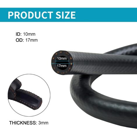 Tuyau de carburant 3 mètres, diamètre 5mm Tuyau de carburant avec collier de serrage 12 pièces pour moteurs, voitures, motos, tracteurs et petits moteurs S'applique à l'essence, au diesel et aux types de machines, telles que les tondeuses à gazon, les tracteurs et de nombreux petits moteurs. Tuyau Pour Pompe à Carburant Tuyau De Carburant 3 Mètres, Diamètre 16mm Tuyau De Carburant Avec Collier De Serrage 20 Pièces Pour Moteurs, Voitures, Motos, Tracteurs Et Petits Moteurs Tuyau Petite Moto Tondeuse Tracteur Matériau de qualité supérieure : les tubes intérieurs et extérieurs du tuyau de carburant sont en caoutchouc, et la couche de renfort centrale est tressée avec des fibres de nylon, qui présente les propriétés de résistance à l'huile, aux hautes températures, de bonnes performances de flexion et de résistance au vieillissement. Le bord surélevé et la surface intérieure lisse des colliers de serrage empêchent les dommages. Contenu de l'emballage : vous recevrez un tuyau de carburant d'une longueur de 3 m, d'un diamètre intérieur de 5mm et d'un diamètre extérieur d'environ 11mm, 12 pièces colliers de serrage en acier inoxydable. Largement Utilisé]Notre tuyau d'essence peut être utilisé pour transporter de l'essence, du diesel, de l'huile, du lubrifiant, etc. Largement utilisé dans les tondeuses à gazon, les motos, les scooters, les moteurs, les tracteurs, les souffleuses à neige, les voitures, etc. Voir plus de détails Signaler un problème avec ce produit Kit de tuyau de carburant de 3 ètres de diaètre 8 avec 10 colliers Les tubes intérieurs et extérieurs sont fabriqués en caoutchouc, et la couche de renfort centrale est en fil tressé en fibre de nylon. Clip en acier inoxydable:le collier de serrage est fabriqué en acier à ressort, solide et durable, et peut être réutilisé. Paroi de tuyau épaisse à 3 couches : l'épaisseur de la paroi du tuyau en caoutchouc est de 3 mm.