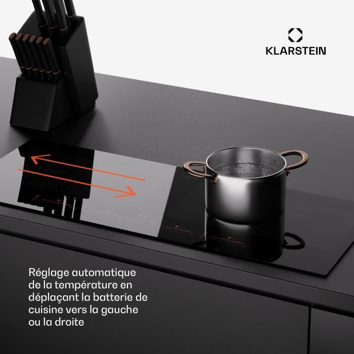 FONCTIONS PRATIQUES : l’indicateur de chaleur résiduelle et la minuterie simplifient l’utilisation quotidienne de votre plaque à induction encastrable en toute sécurité. Acier et verre contrastés Que vous soyez un cuisinier passionné ou que vous recherchiez simplement une plaque à induction encastrable fiable et facile à utiliser, ce modèle de 90 cm est la pièce maîtresse idéale pour toute cuisine moderne. La table de cuisson est-elle équipée de dispositifs de sécurité ? Oui, il est équipé d'une sécurité enfants, d'un indicateur de chaleur résiduelle, d'un détecteur de casserole et d'une protection contre la surchauffe pour une utilisation quotidienne en toute sécurité. Comment fonctionne la table de cuisson ? La table de cuisson est équipée d'un curseur tactile précis à neuf niveaux de puissance, permettant un contrôle intuitif et précis des réglages de chaleur. Klarstein Victoria Plaque De Cuisson Vitrocéramique - 45 Cm, 3 Zones 5000 W Design Retro Curseur Tactile Minuterie Securite Enfants Double Zone Surface Facile A Nettoyer 90189093 Commande tactile précise Réglez la chaleur d'un simple geste. La minuterie intégrée et la fonction de chauffage rapide facilitent le multitâche dans la cuisine, tandis que la sécurité enfants et l'indicateur de chaleur résiduelle garantissent la sécurité de votre famille. Cette table de cuisson à induction encastrable est conçue pour ceux qui souhaitent que leur cuisine soit aussi belle que leurs plats sont savoureux. Finition acier inox raffiné Cuisinez de manière plus intelligente, plus sûre et avec plus de style que jamais. Combien de zones de cuisson la table de cuisson à induction Klarstein Verosteel comporte-t-elle ? Il est équipé de cinq zones de cuisson à induction puissantes avec fonctions boost, offrant une puissance totale de 12 200 W pour une cuisson flexible et rapide. Quelles sont les fonctions pratiques qui facilitent la cuisine ? La table de cuisson est équipée d'une minuterie, d'une fonction de chauffage rapide et de la fonction ThermoRecall, qui rétablit la dernière température utilisée après une pause. La surface en verre céramique brillante est résistante et lisse, ce qui permet d'essuyer facilement les éclaboussures et les taches. L'acier inoxydable brossé et les lignes épurées offrent une élégance moderne et intemporelle à toute cuisine contemporaine. Dimensions : 90 × 52 × 6,9 cm (L × P × H). Contenu de la boîte : table de cuisson à induction Klarstein Verosteel, manuel d'utilisation multilingue. La surface de cuisson est-elle facile à nettoyer ? Tout à fait. Grâce à la détection des casseroles et à la protection contre la surchauffe, vous pouvez cuisiner en toute confiance à chaque fois. En acier inoxydable brossé ou noir avec des touches de verre, ces appareils offrent un design urbain et industriel, un éclairage d'ambiance et une qualité professionnelle. Klarstein Plaque à Induction 3 Plaques - Plaque à Induction Encastrable Avec 3 Plaques De Cuisson Plaque A Induction 7000 Watt Plaque A Induction Avec Ecran Tactile Et Minuterie Plaque A Induction Electrique Efficace Wit Caractéristiques principales : table de cuisson à induction encastrable de 90 cm au design élégant et minimaliste ; cinq zones de cuisson à induction de haute qualité avec fonction Boost pour un chauffage ultra-rapide ; puissance totale : 9 300 W (jusqu'à 12 200 W en mode Boost) ; Commande tactile intuitive pour des réglages sans effort ; neuf niveaux de puissance pour s'adapter à toutes les recettes ; ThermoRecall pour des pauses de cuisson en toute simplicité ; minuterie, chauffage rapide et détection des casseroles pour un confort optimal ; sécurité enfants et indicateur de chaleur résiduelle pour une sécurité accrue ; surface en verre haut de gamme facile à nettoyer. Acier pour une esthétique audacieuse Klarstein Verosteel : style cuisine professionnelle Transformez votre cuisine avec la gamme d'appareils Klarstein Verosteel. Test complet de la plaque à induction cIARRA : performance et innovation Spécifications : Zones de cuisson – 5 (19 cm/2000 W Boost 2600 W, 19 cm/1500 W en mode Boost 2000 W, 28 cm/2300 W en mode Boost 3000 W, 19 cm/2000 W en mode Boost 2600 W, 19 cm/1500 W en mode Boost 2000 W) ; Puissance : 9 niveaux ; tension : 220~240 V ; commande : curseur tactile ; surface : verre ; minuterie, chauffage rapide, protection contre la surchauffe, détection des casseroles.