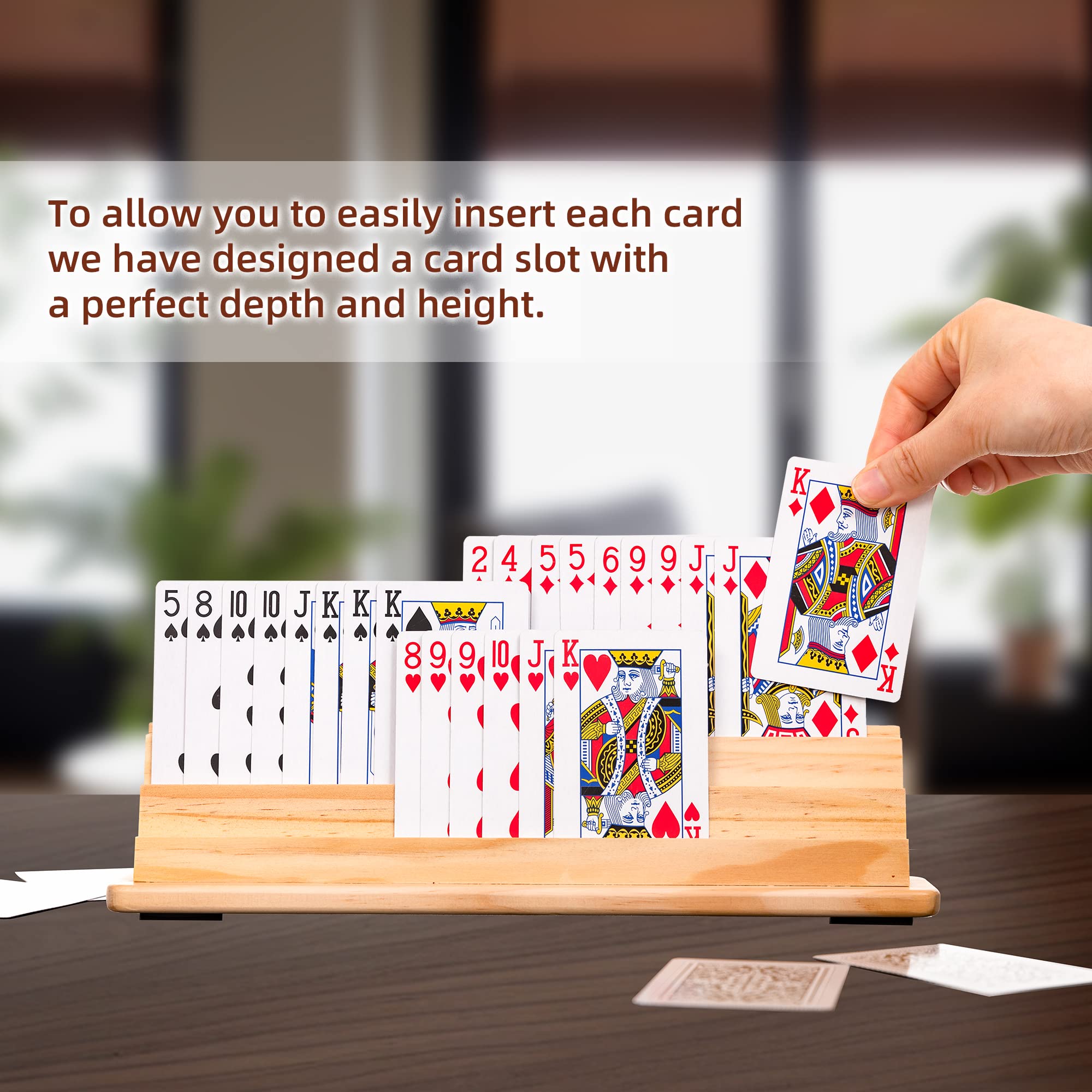 Caractéristiques : - Le porte-cartes pour petites mains est conçu pour les enfants dont les mains ne suffisent pas pour accueillir toutes les cartes ; il convient également aux personnes âgées et aux personnes qui ne peuvent pas bien tenir des cartes. Ils vous permettent de vous concentrer pleinement sur votre jeu sans désagréments ni distractions. Libérez vos mains : en utilisant le porte-cartes pour enfants, les joueurs peuvent facilement libérer leurs mains et se concentrer davantage sur le jeu lui-même. Chaque rangée de cartes augmente en hauteur pour vous permettre une vue plus confortable. Chaque porte-cartes pour enfants est légèrement incurvé pour empêcher les autres de voir vos cartes et pour offrir une base stable. Il est très approprié pour les enfants ou les adultes souffrant d'arthrite. Facile à organiser : design incurvé, facile à organiser et à afficher, chaque rangée de cartes est claire en un coup d'œil Accessoire Jeu Cartes Seniors Porte-cartes Jeu En Bois Waldspring - Lot De 2 - 4 Rangées Par Support - Enfants Et Seniors - Jeux De Cartes Porte-cartes Enfants Le design du porte-cartes en bois pour enfants vous offre suffisamment d'espace pour organiser facilement vos cartes et empêche ainsi efficacement les cartes de tomber. Vous pouvez également y ranger des photos, des cartes de visite et des bons d'achat, ce qui en fait une solution de rangement élégante. Utilisation : lot de 2 porte-cartes pour enfants, le compagnon idéal pour les soirées de jeu en famille. Organisez votre jeu : chaque étagère peut contenir 60 cartes, de sorte que vous avez beaucoup d'espace pour construire votre feuille gagnante. Support De Cartes à Jouer Porte-cartes De Jeu En Bois Incurvé Pour Enfants, Adultes, Personnes Rangement Cartes Jeu Lot de 3 cartes en bois • La SPA - Les porte-cartes pour enfants sont fabriqués en bois de haute qualité, robuste, lisse, résistant à l'usure et à la corrosion. Ces porte-cartes sont conçus pour maintenir vos cartes en toute sécurité. Nos porte-cartes à jouer offrent une grande valeur de divertissement pour toute la famille, que ce soit pour les grands ou les petits, les enfants ou les personnes âgées. Porte-cartes à jouer Avec le support de poker, les joueurs ont les mains libres et peuvent mieux se concentrer sur le jeu. - Le porte-cartes à jouer peut non seulement être utilisé pour les cartes à jouer, mais aussi pour les cartes de table, les cartes de visite, les cartes bancaires, les billets, les notes, etc. Qu'il s'agisse d'un poker classique, d'un pont ou des jeux de cartes préférés des enfants comme Kynastic et Pictionary, il les soutient parfaitement tous.