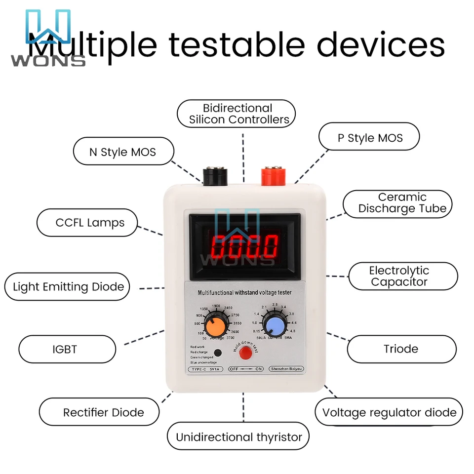 10 accessoires de ligne de test pour pinces crocodiles Gettimore Testeur de tension CC réglable 50 V-3700 V IGBT MOS Tests précis de tensions avec notre testeur de tension de résistance multifonction, offrant une sortie réglable de 50 V CC à 3700 V avec une précision remarquable, ce qui en fait un outil essentiel pour tout environnement professionnel Curseur de tension de sortie : ± 50 V, avec curseur de sortie réelle 3650-3750 V. Dimensions : 98 x 70 x 37 mm. Mode de sortie : tension constante, courant constant de sortie toute la machine. Tension de sortie réglable : DC 50 V-3700 V. [Rappel des tailles] Veuillez vous référer aux spécifications du produit pour les dimensions au lieu du tableau des tailles d'Amazon. Par exemple, le test de tension d'isolation entre les interrupteurs, les boutons et deux broches de connecteurs., 2., Produit de petite taille., 3., Facile à transporter et à ranger., 4., Pratique pour tester l'isolation entre les moteurs, les transformateurs de fréquence d'alimentation, les transformateurs haute tension, l'isolation de phase et l'isolation du noyau de la coque., 5., Utilisé pour des mesures étendues : pour NIMOS/pour PMOS/ pour IGBT/triode/thyristor unidirectionnel/régulateur de tension/diode électroluminescente/pont de réglage/varistance/tube de décharge/capacité dynamique/valeur de résistance à la tension. Testeur Portable DC 50-3700V Testeur De Transistor DC 50-3700 V - Testeur De Tension - Appareil De Appareil Pour La Tension Puissance maximale : 5 Résolution du voltmètre : 0,1 V inférieur à 100 V, 1 V au-dessus de 100 V. Testeur transistor multimètre diode triode puzzles - Test et Avis Interface : type C (lumière rouge allumée lorsque vous travaillez, lumière verte allumée lorsque la charge est complète). Test d'isolation facile : testez facilement l'isolation entre les moteurs, les transformateurs de fréquence d'alimentation, les transformateurs haute tension, et plus encore pour une performance et une sécurité optimales dans les systèmes électriques. Couleur : lumière bleue, lumière rouge, lumière verte. Capacité de la batterie : batterie au lithium 700 mA. Design compact et portable : avec une petite taille de 98 x 70 x 37 mm, ce testeur est facile à transporter et à ranger, ce qui le rend parfait pour les professionnels et les techniciens en déplacement. Contenu du paquet : 1 testeur 1 manuel d'instructions (français non garanti). Fonction de protection : 80 % de surchauffe pour la protection (lumière bleue allumée à haute température). Caractéristiques : Nom de la pièce : testeur de transistor., Matériau : ABS.