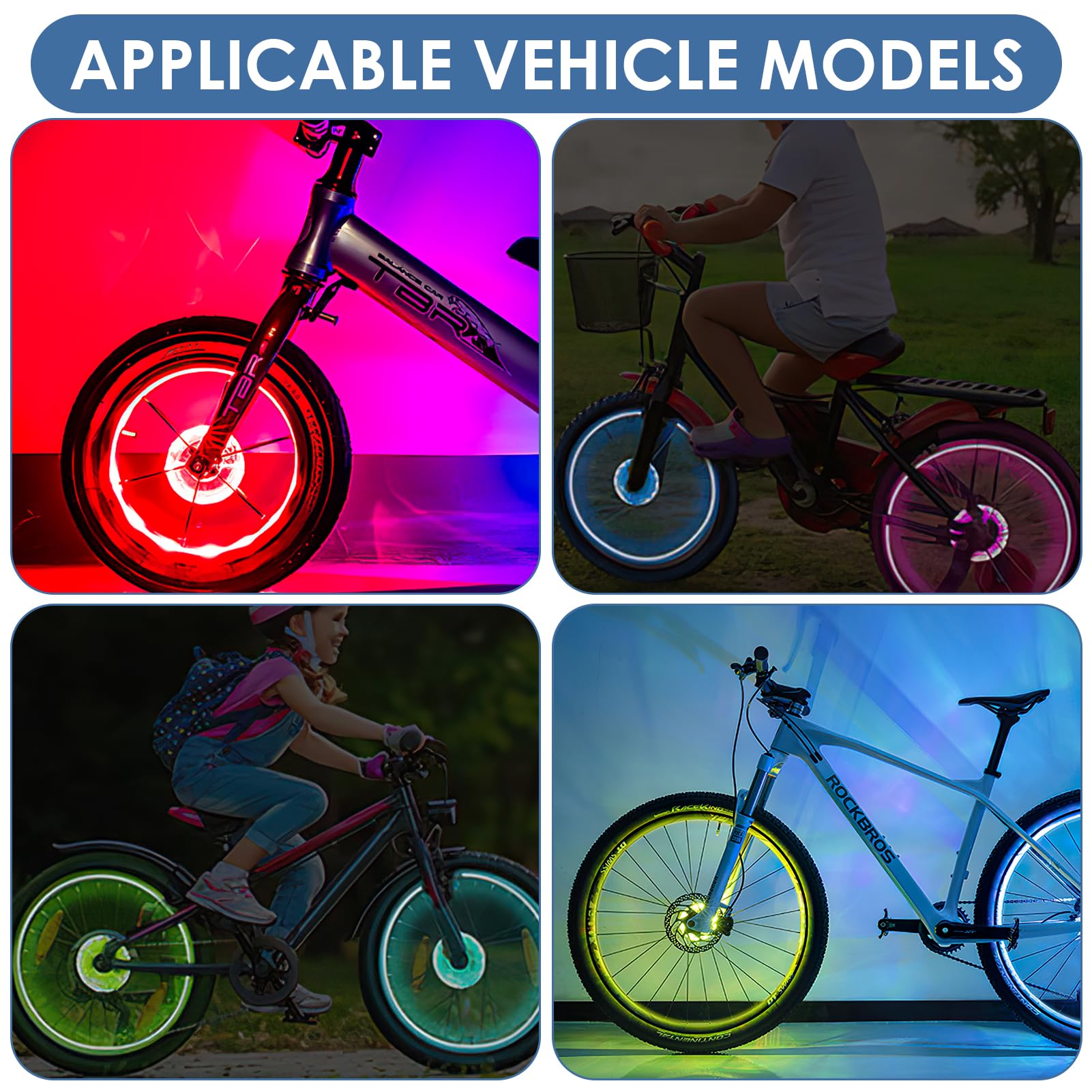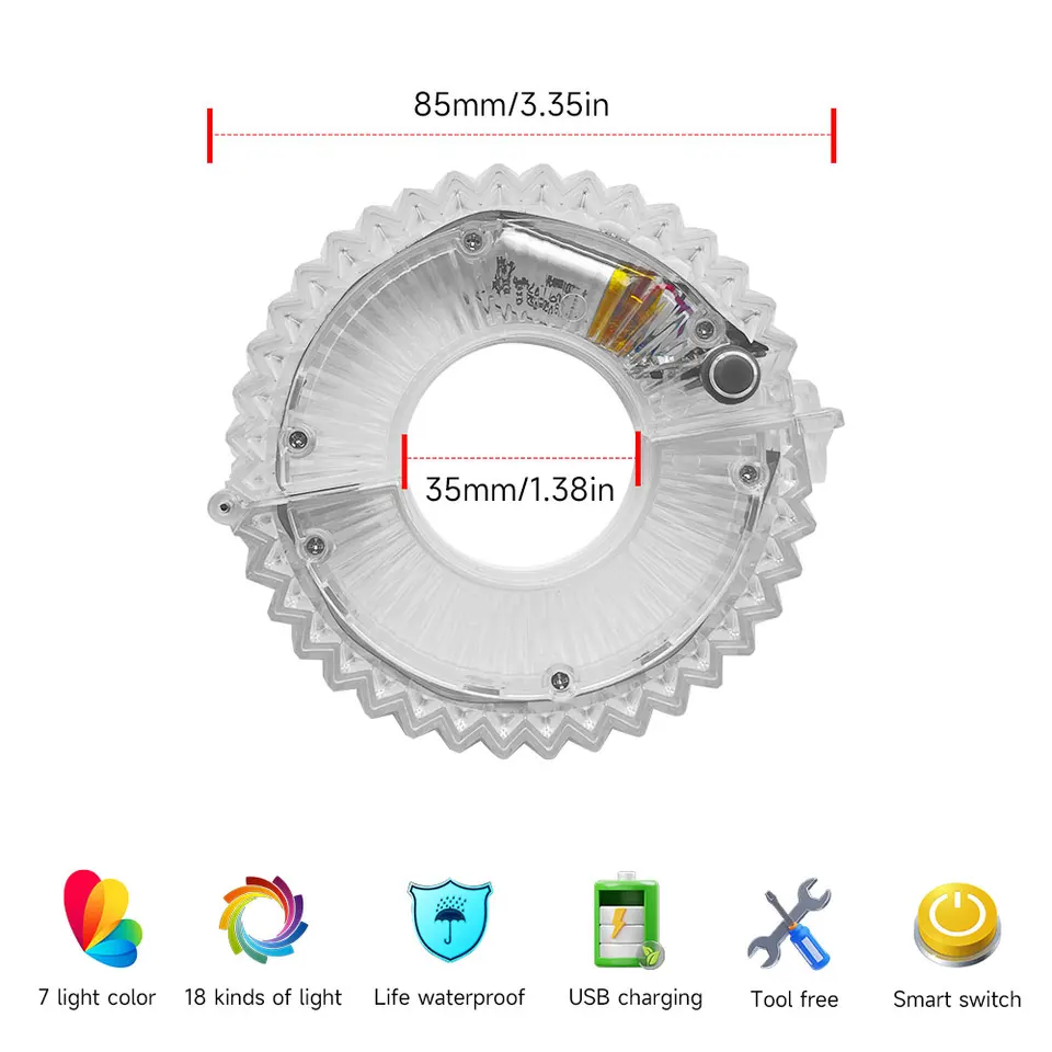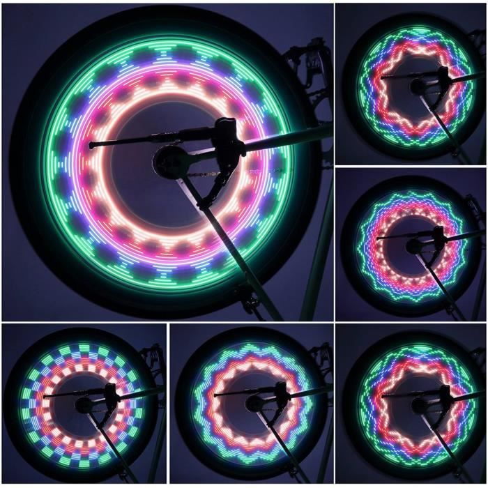 Rayon Velo Rechargeable Vu00e9lo Moyeu De Roue Lumiu00e8res Avec 7 Couleurs 15 Modes, LED Vu00e9lo Rayu00e9 Lampe Pour Avertissement De Su00e9curitu00e9 Et Vu00e9lo Du00e9coration (Vibration Led Roue Velo 【Changement à votre guise】 Notre trottinette LED Roue lumière vélo est pratique et facile à utiliser. FORAUTO 2 pièces roue de voiture lumière LED moto vélo lumière pneu... Tube LED flexible multicolore pour roue de vélo. Fun et en sécurité Fonctionne parfaitement par tous les temps, garantissant durabilité et fiabilité. Appuyez sur le bouton pendant 1 seconde pour l'allumer ou l'éteindre, maintenez-le enfoncé pendant 5 secondes pour passer en mode clignotant, et appuyez brièvement pour changer facilement le mode et la couleur d'éclairage. Rezshop Lumières LED rechargeables pour roue de vélo – (2 pneus 7 couleurs en 1) – Moyeu étanche – Accessoires de vélo ultra lumineux pour enfants, filles, garçons, adultes La trottinette LED Roue lumière vélo est équipée d'un voyant de charge : vert : pleine charge ; rouge : charge en cours. 【7 Couleurs et 18 modes 】Cette trottinette LED Roue lumière vélo dispose de 7 couleurs changeantes, chacune offrant différents effets d'éclairage dynamiques. 【Installation facile】LED Roue lumière vélo ne nécessite aucun outil d'installation. Avec une excellente étanchéité IP65 et une bague d'étanchéité renforcée, Lampe pour moyeu de scooter d’enfant résiste efficacement à l'érosion par la pluie et la poussière. Convient à la plupart des voitures pour enfants et des voitures d'équilibre (sauf roues intégrées). Sa batterie lithium intégrée de 300 mAh offre une autonomie d'environ 8 à 12 heures, pour que vos enfants puissent profiter pleinement de la trottinette. 【Chargement USB】 La trottinette Lampe pour moyeu de scooter d’enfant est dotée d'un chargement USB pratique, sans remplacement de batterie. Avec un total de 18 modes, il suffit d'un clic pour changer de mode.