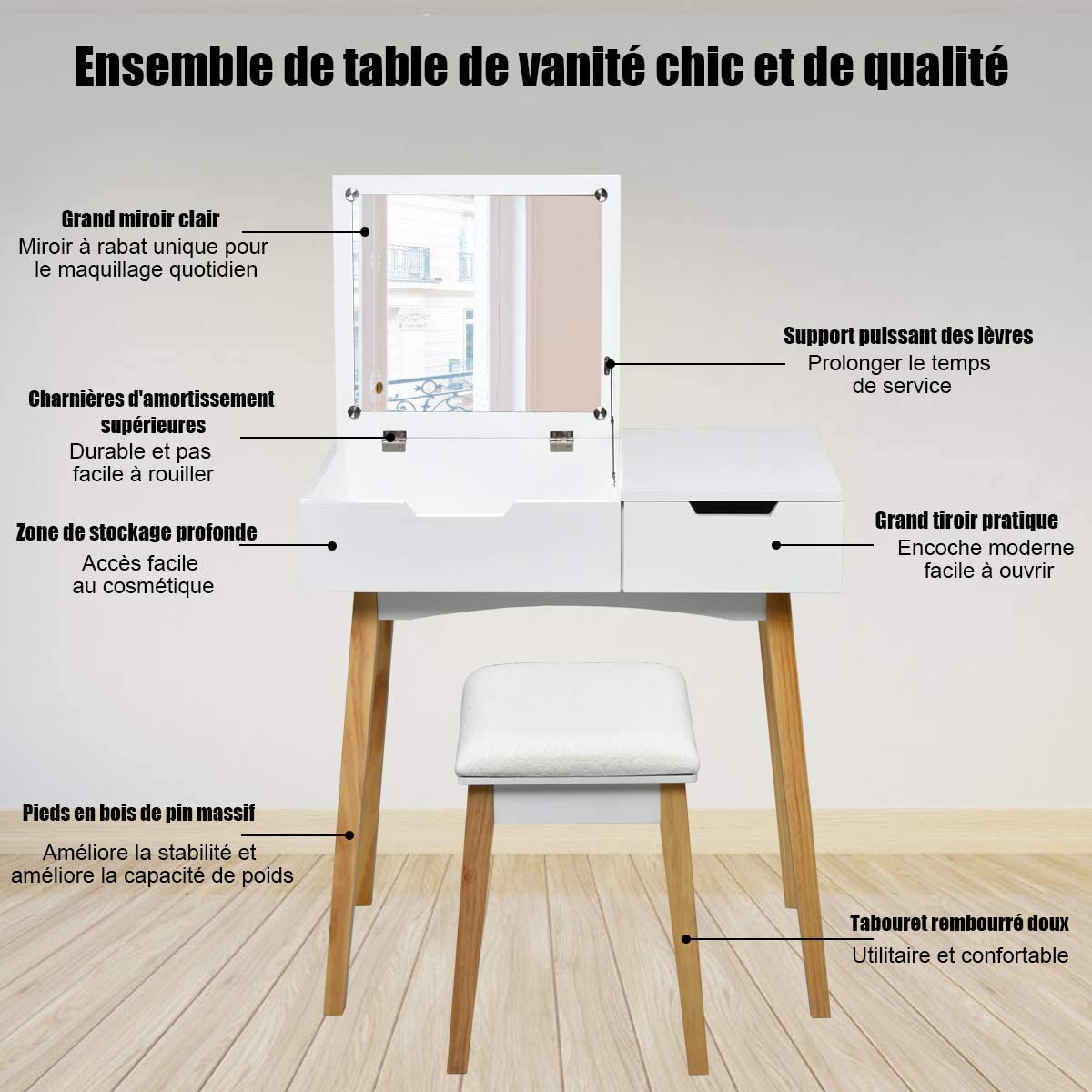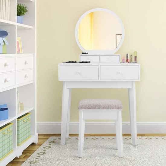 Lorsque le miroir n'est pas nécessaire, les éléments de la table peuvent être retirés pour libérer suffisamment d'espace pour l'utiliser comme bureau. Plateau amovible pour transformer la table en coiffeuse ou en bureau Capacité de charge par la table: 100 kg 【Installation Facile】Le plateau et le miroir préinstallés facilitent et accélèrent l'installation. Dimensions du tabouret: 40 x 30 x 46 cm (L x l x H) Coiffeuse Avec Miroir Costway Coiffeuse Moderne Avec Miroir Et Tabouret, table De Maquillage En Bois Avec 5 Tiroirscoiffeuse Fillemeuble De Salle De Sejourmaison De Campagneorganisateur De Rangement Blanc Coiffeuse Enfant Chaque tiroir est doté d'un bouton rond argenté pour faciliter l'ouverture et la fermeture. 【Pieds en Bois Massif】La coiffeuse est dotée de pieds en bois de tung robustes et durables. Coiffeuse avec 10 Ampoules LED,Luminosité Réglable,Table de Maquillage... Coiffeuse Vintage COSTWAY Coiffeuse Avec 5 Tiroirs, Miroir Pivotant Et LED Tabouret Coiffeuse 【Coiffeuse avec Miroir 2 en 1】La conception 2 en 1 permet d'utiliser au mieux l'espace de la table de la commode. Grand plateau de table offrant de la place pour vos cosmétiques, des articles de beauté, etc. Coiffeuse de Maquillage - Coiffeuse fille Tunisie | Meilleur Prix Matériaux: MDF, Paulownia et éponge 【Grand Espace de Rangement】En plus d'un grand plateau pour exposer vos objets de tous les jours, les 5 tiroirs du haut et du bas offrent un espace de rangement pour les bijoux et les cosmétiques afin d'organiser vos effets personnels. Caractéristiques : Fabrication en panneaux MDF de qualité et pieds en paulownia robuste Dimensions du produit : 80 * 40 * 136 cm.